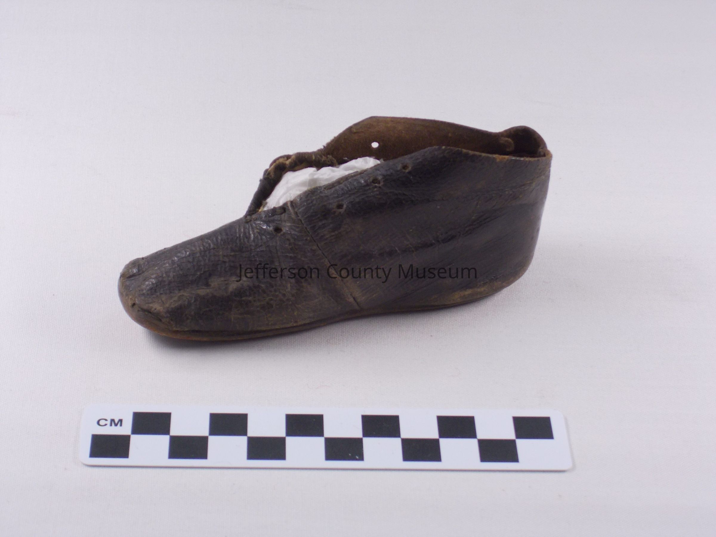One child's brown leather shoe with four holes for laces.