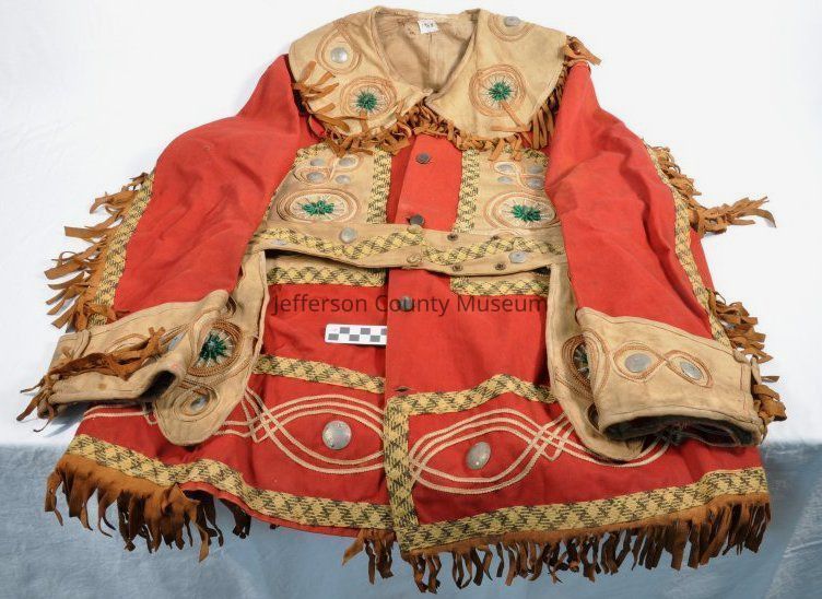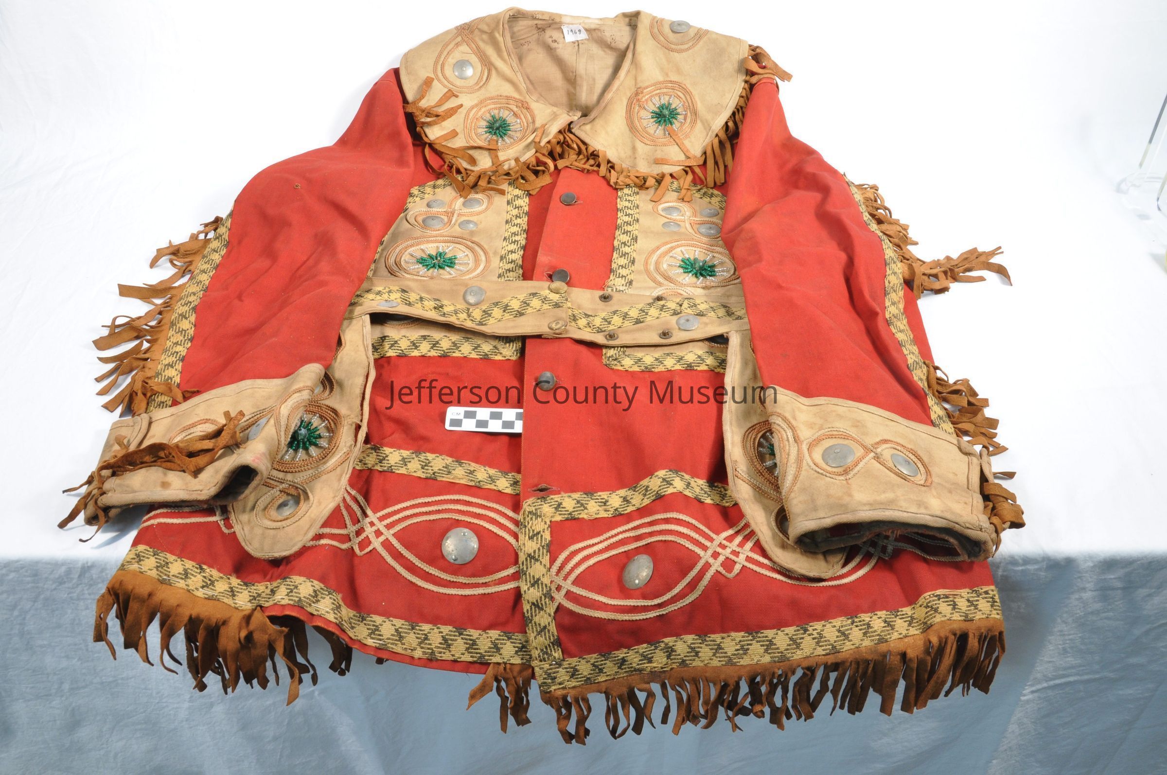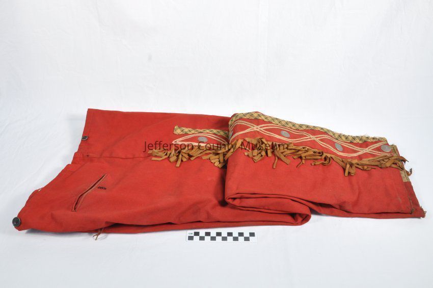 Red Men Native American outfit includes red jacket (a) with leather fringes on sleeves and bottom, bead and metal disks on two panels on the front and on the collar and cuffs. Large belt with bead work and metal disk. There are red pants with the outfit (b) with the same fringe and metal disk decoration. On the waist band of the pants is a cloth label that reads "W. H. RUSSELL".
