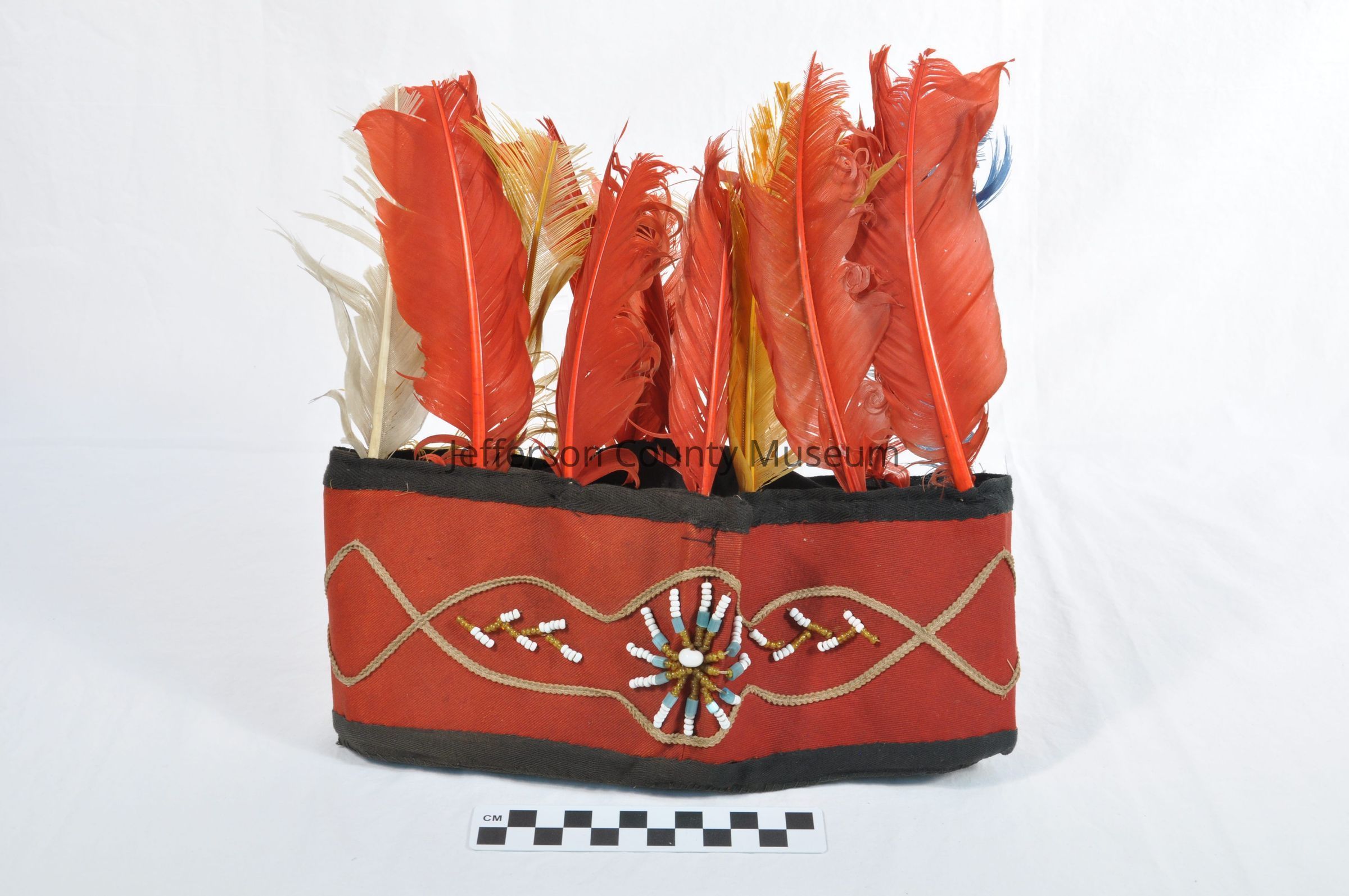 Red Men headband of red and black cloth blue and white bead work on front and red, blue, orange and white feathers sticking out of the top of the headband. Cloth label sewn inside reads "W. H. RUSSELL".