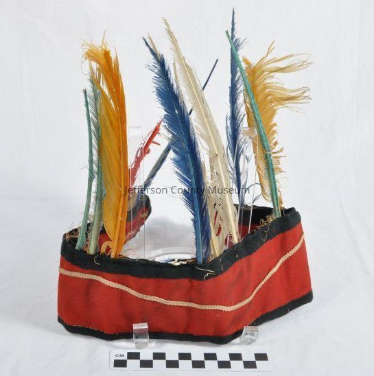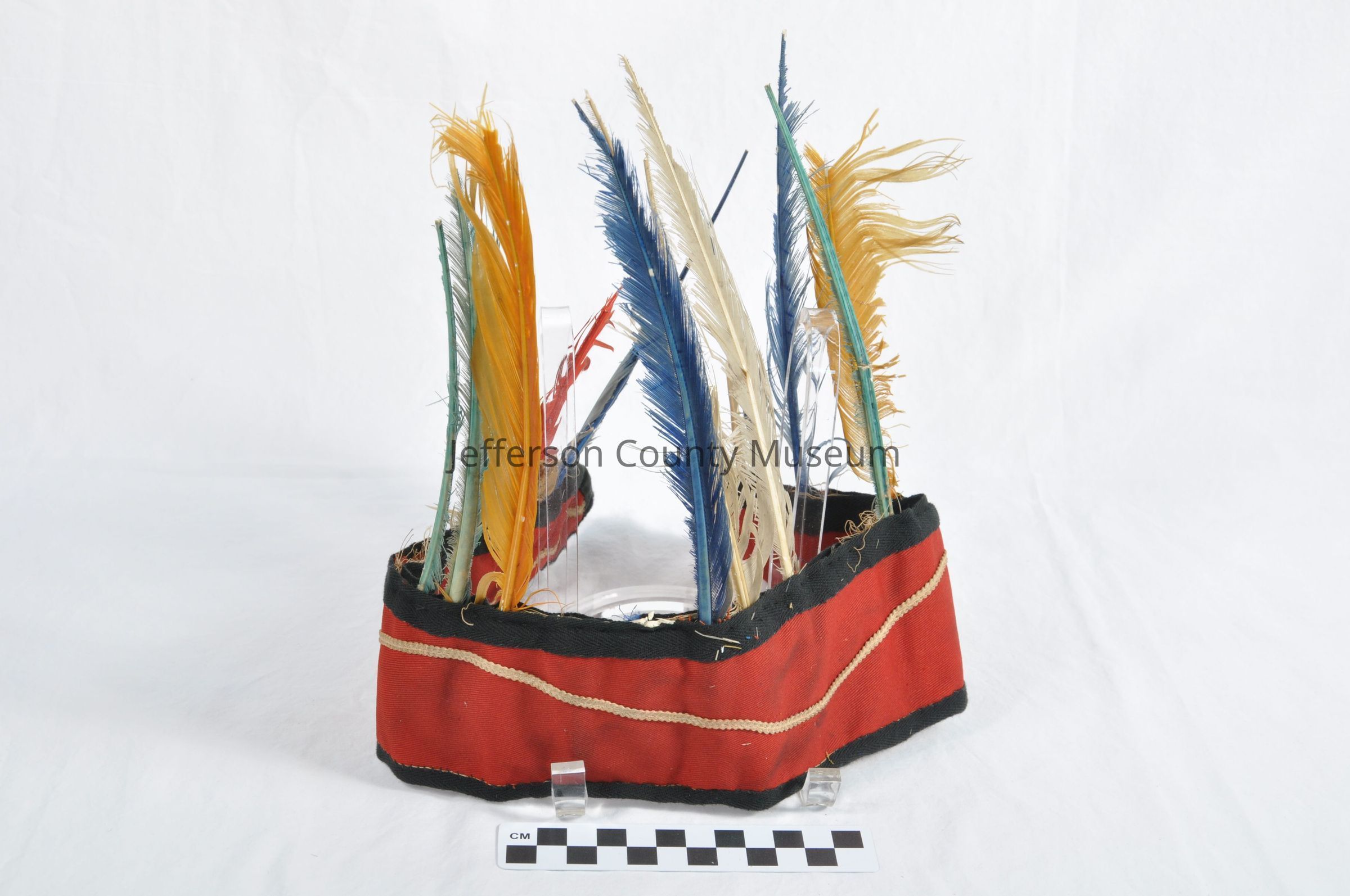 Red Men headband of red and black cloth with red, blue, green, orange and white feathers sticking out of the top.