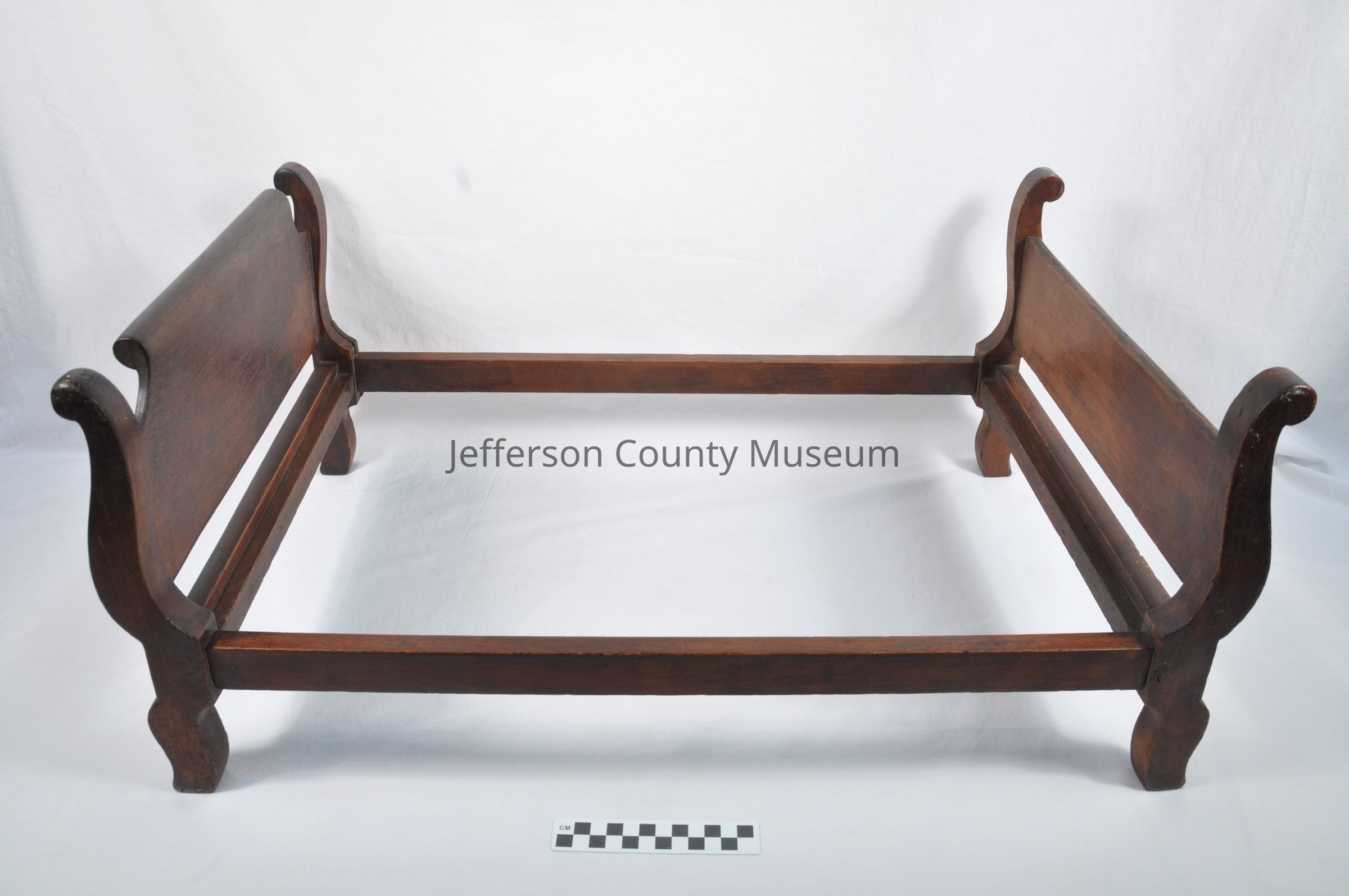Wooden doll bed possibly mahogany all one piece with head board and foot board. Head board is solid with heavy posts on sides. Foot board has a wide board with heavy posts.Acquisition