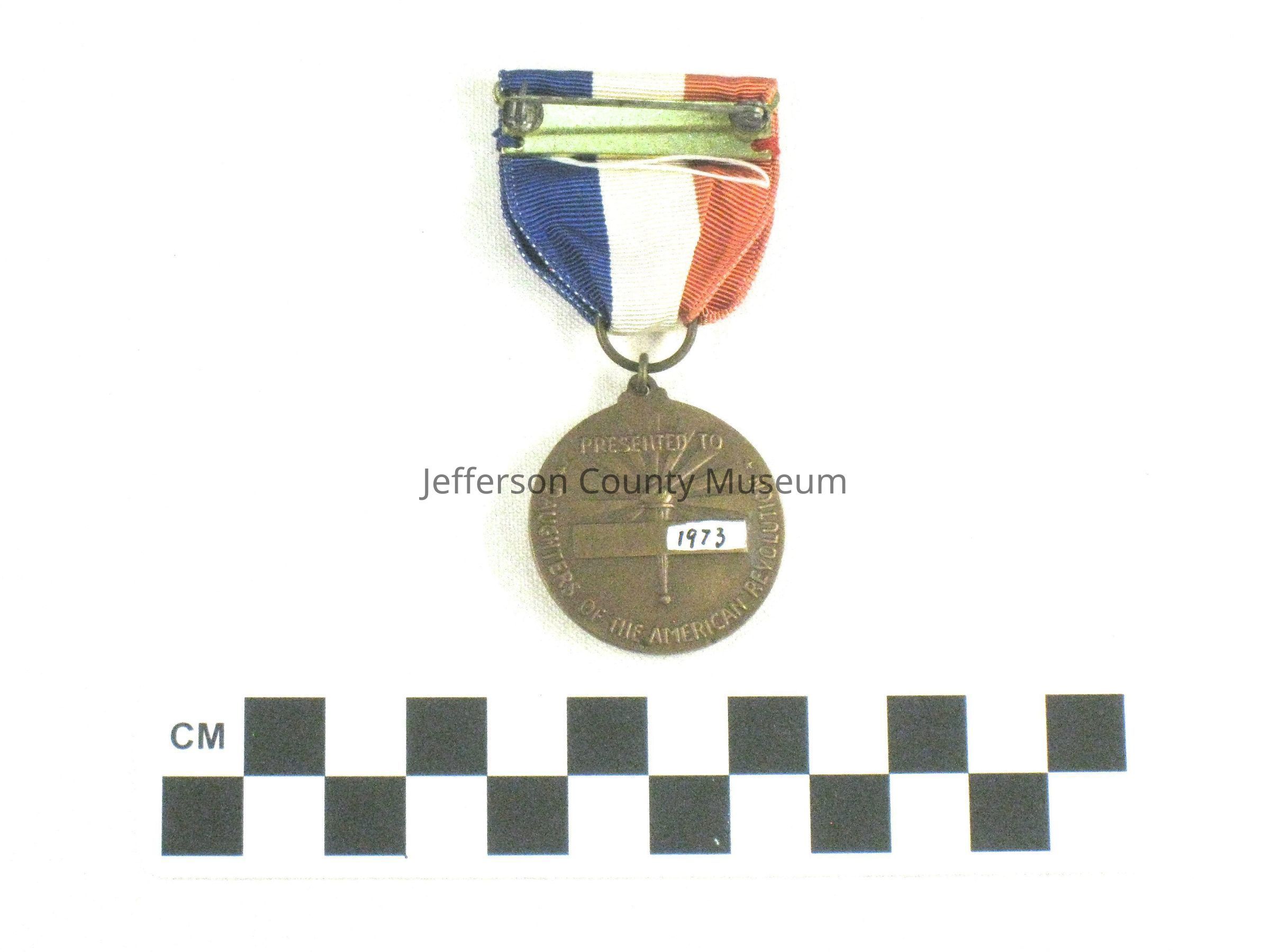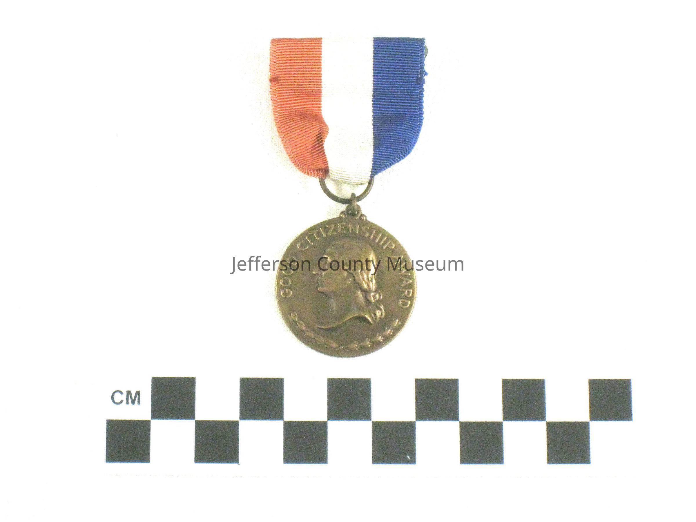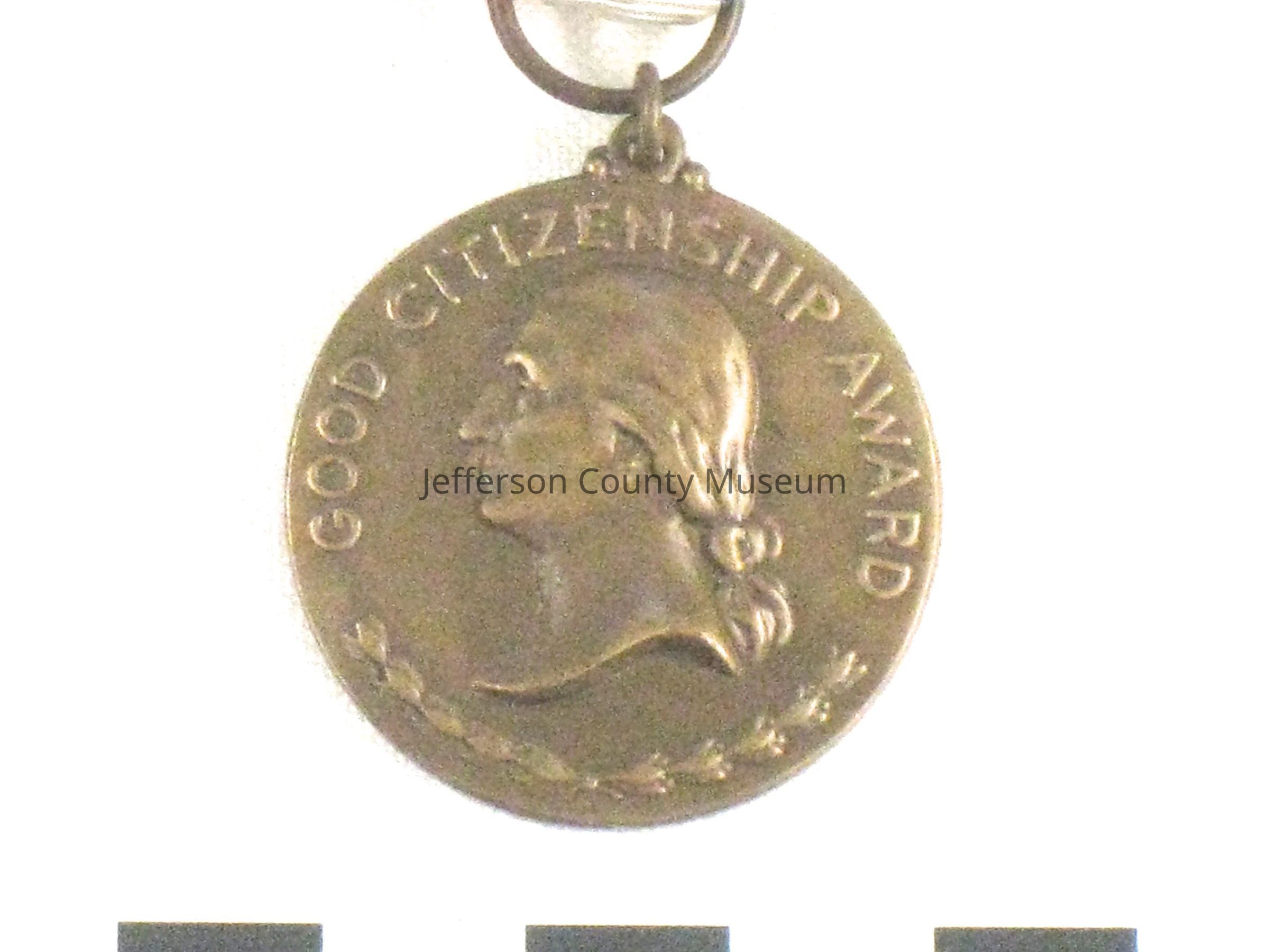 Round bronze colored medal with red, white and blue ribbon above. On the medal is a bust profile of George Washington facing right. Around his head are the words "GOOD CITIZENSHIP AWARD". On back is a torch with a rectangular space for a name with no name. Around the back is "PRESENTED TO_________DAUGHTERS OF THE AMERICAN REVOLUTION".Acquisition