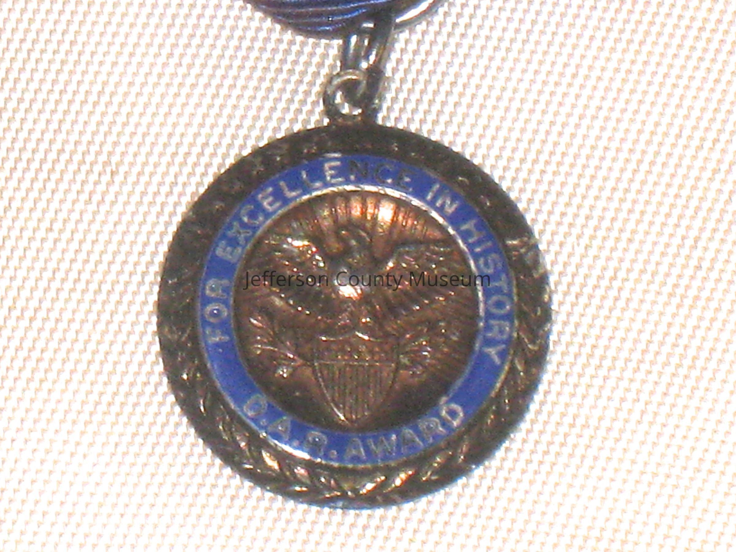 Medal with dark blue ribbon above. Medal is dark bronze color with American eagle in center. An enameled blue circle is around the eagle with the words "FOR EXCELLENCE IN HISTORY DAR AWARD". Back is silver.Acquisition