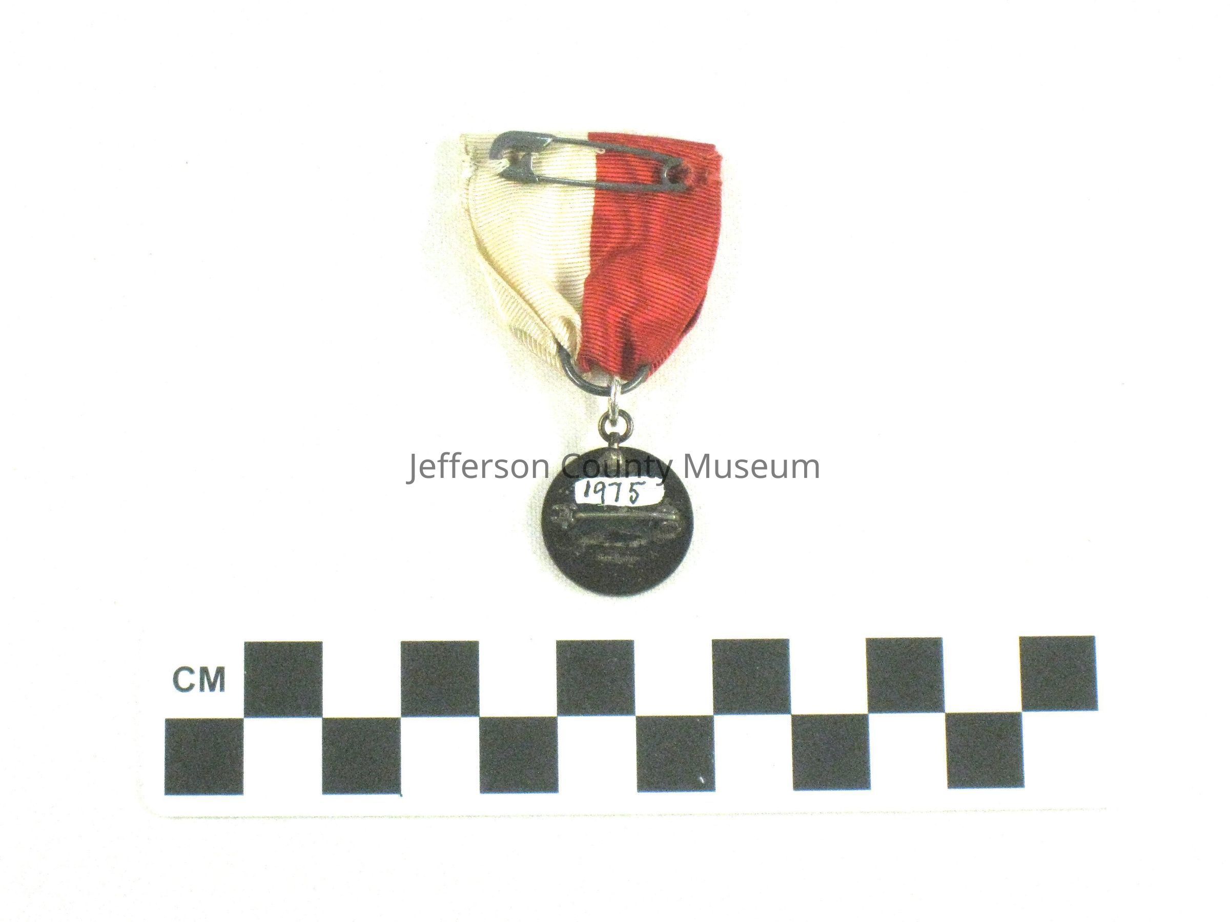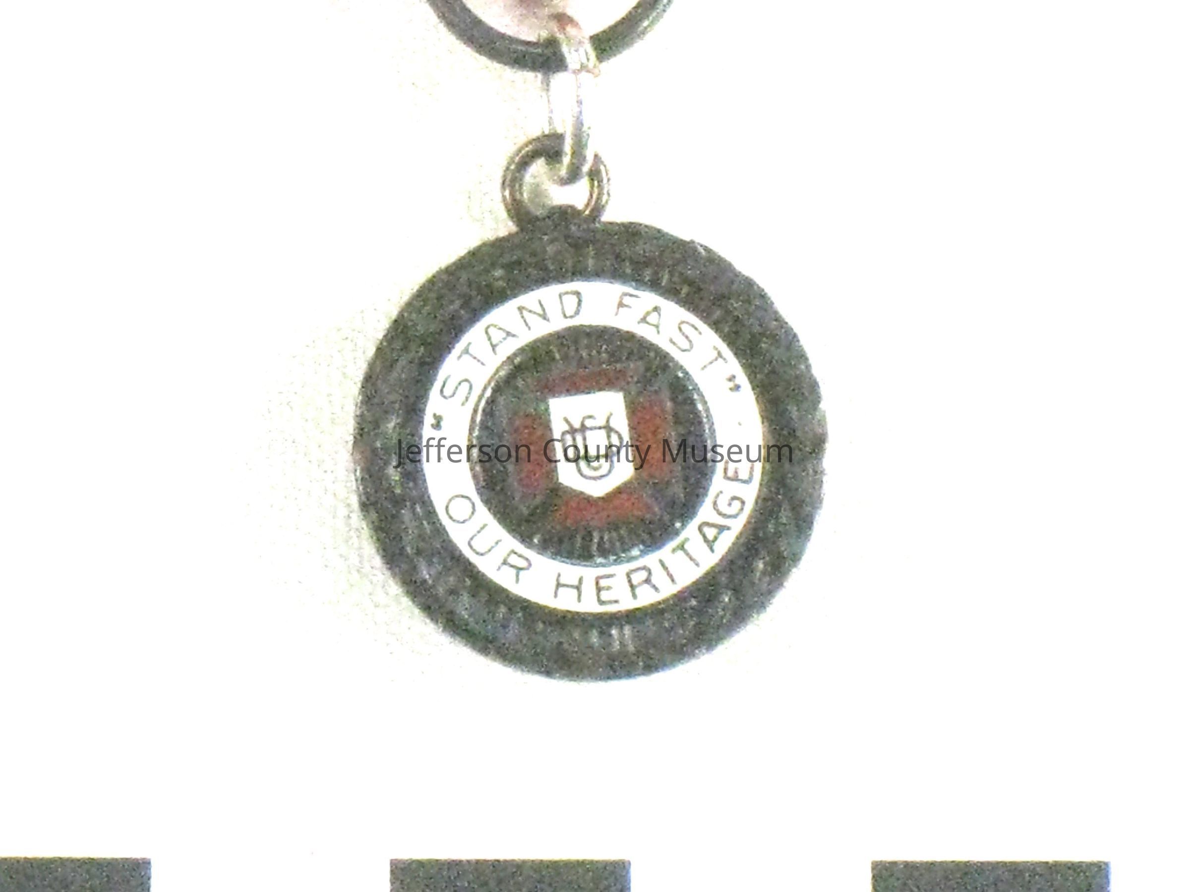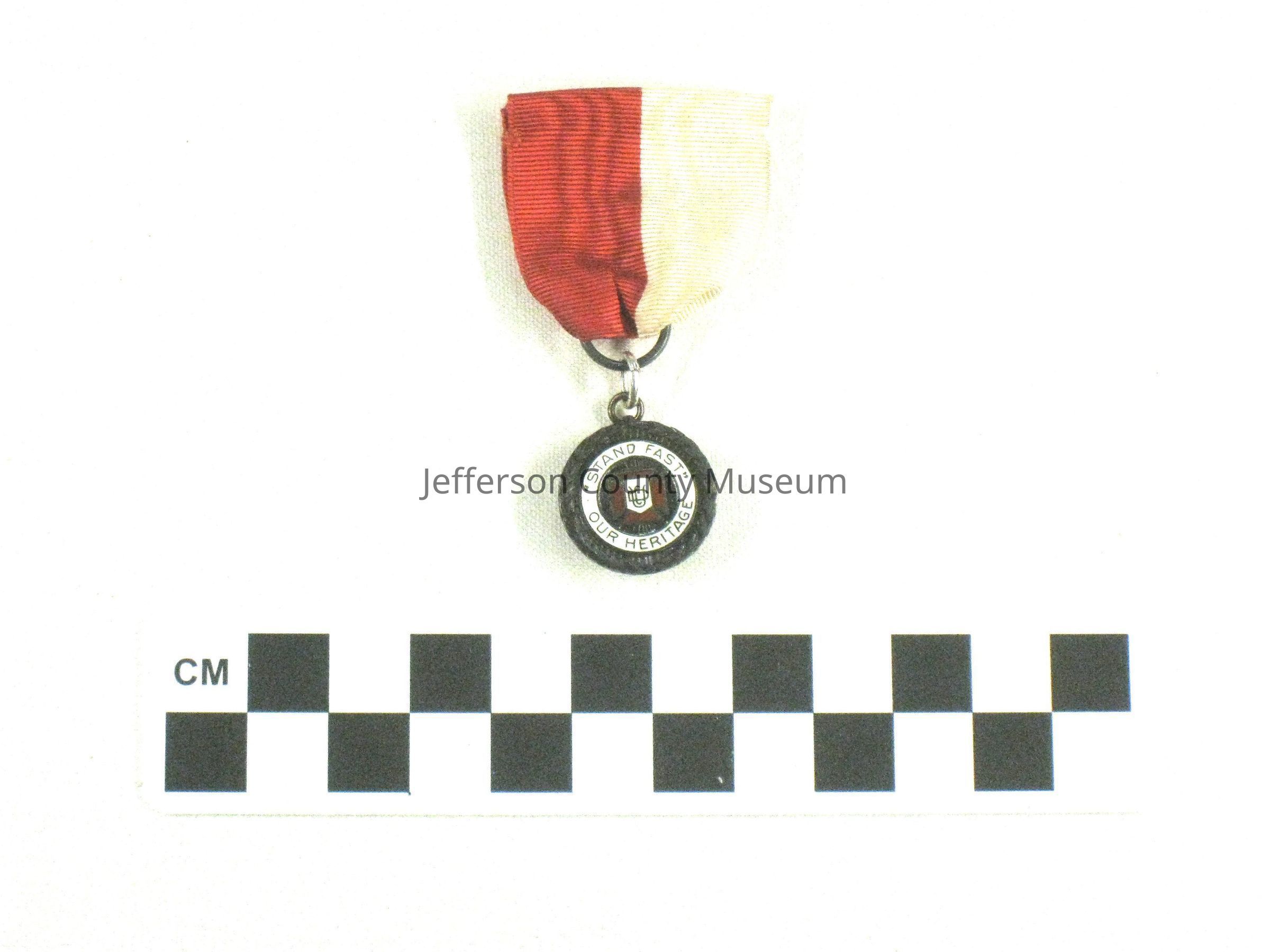 Medal with bronze colored wreath around outside. Red and white ribbon above. Center of medal is red and white enameled motto and logo. Around white enameled ring are the words "STAND FAST OUR HERITAGE". In center is a red iron cross with white superimposed letters "UDC". On underside of lid of box is a handwritten note in brown ink "Presented by Lawson Botts Chapter, United Daughters of the Confederacy, to the Girl for the best essay on 'The Causes of the War Between The States.' ". On back of medal is "STERLING" and a pin for pinning to clothing.Acquisition
