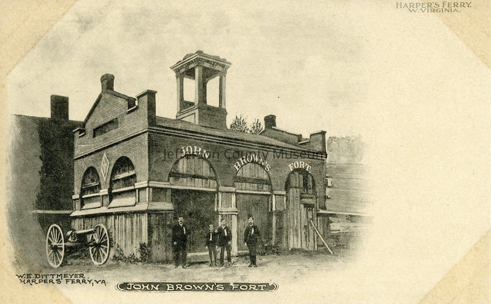 John Brown's fort with four men standing in front of the building. Printed in upper right corner: "HARPER'S FERRY, W. VIRGINIA." Printed in lower left corner: "W. E. DITTMEYER, HARPER'S FERRY, VA."Acquisition