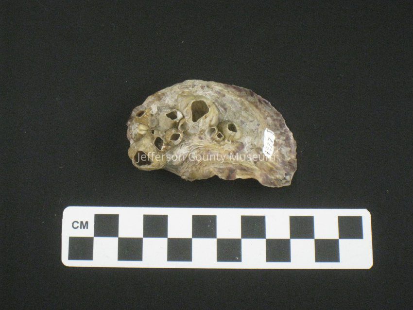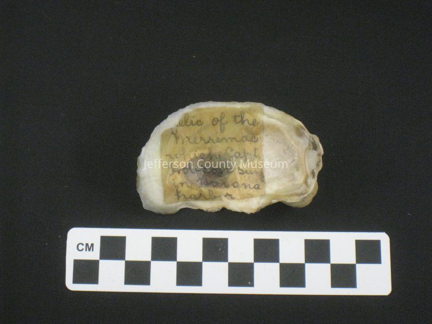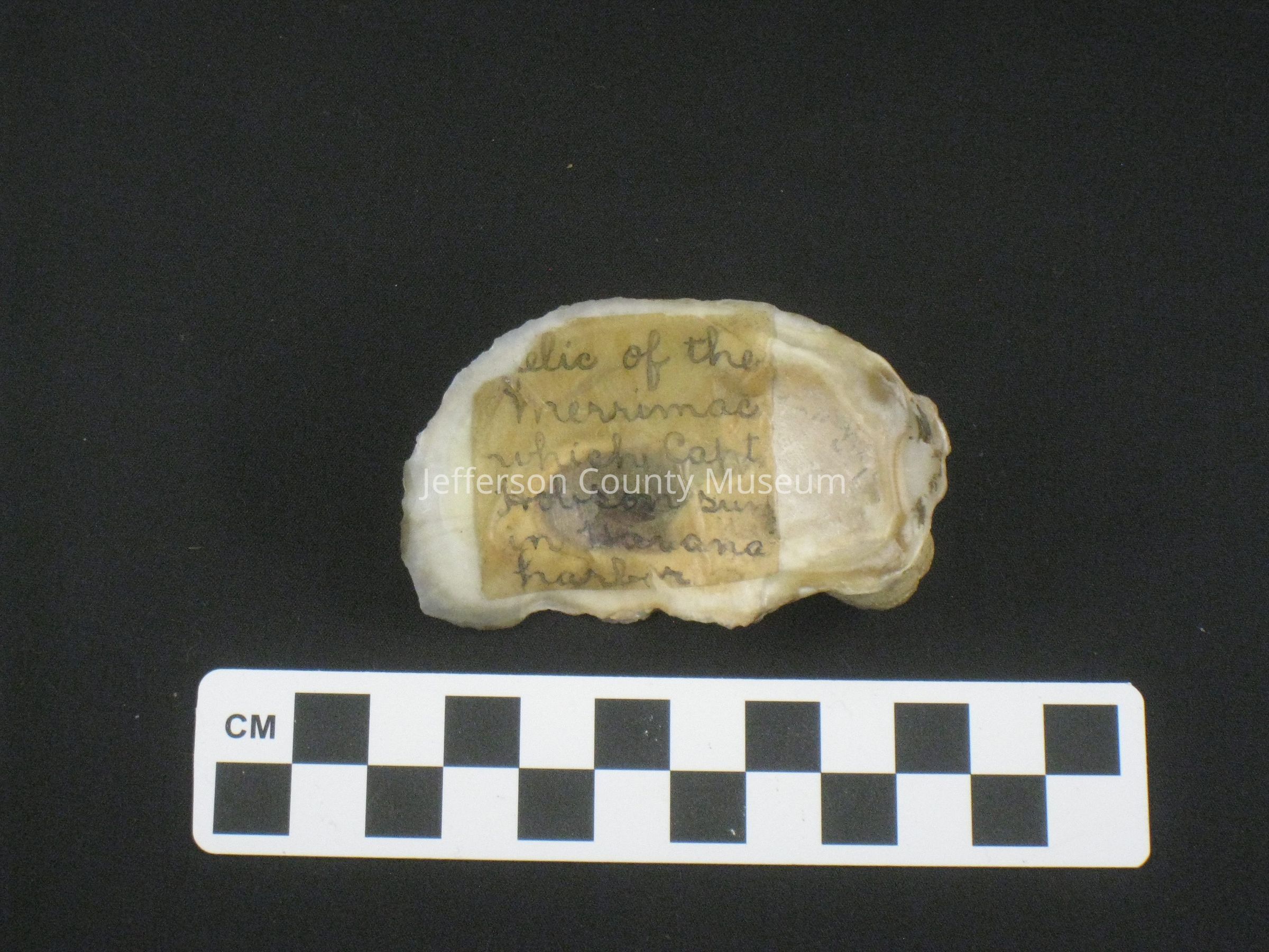 Half of an oyster shell with several barnacles attached to the outside. A note attached to the inside says "-elic of the Merrimac which Capt. Hobson sun- in Havana harbor".Acquisition