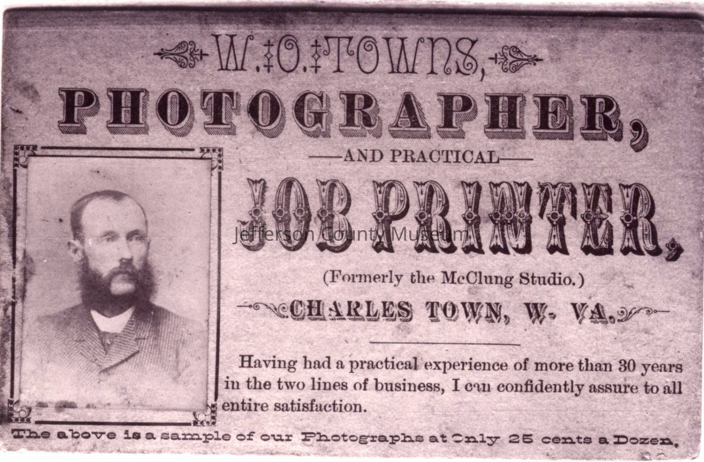 Advertisement for William Oliver Towns, photographer and job printer in Charles Town, West Virginia. Formerly the McClung Studio.Acquisition