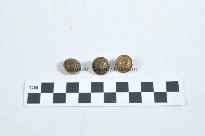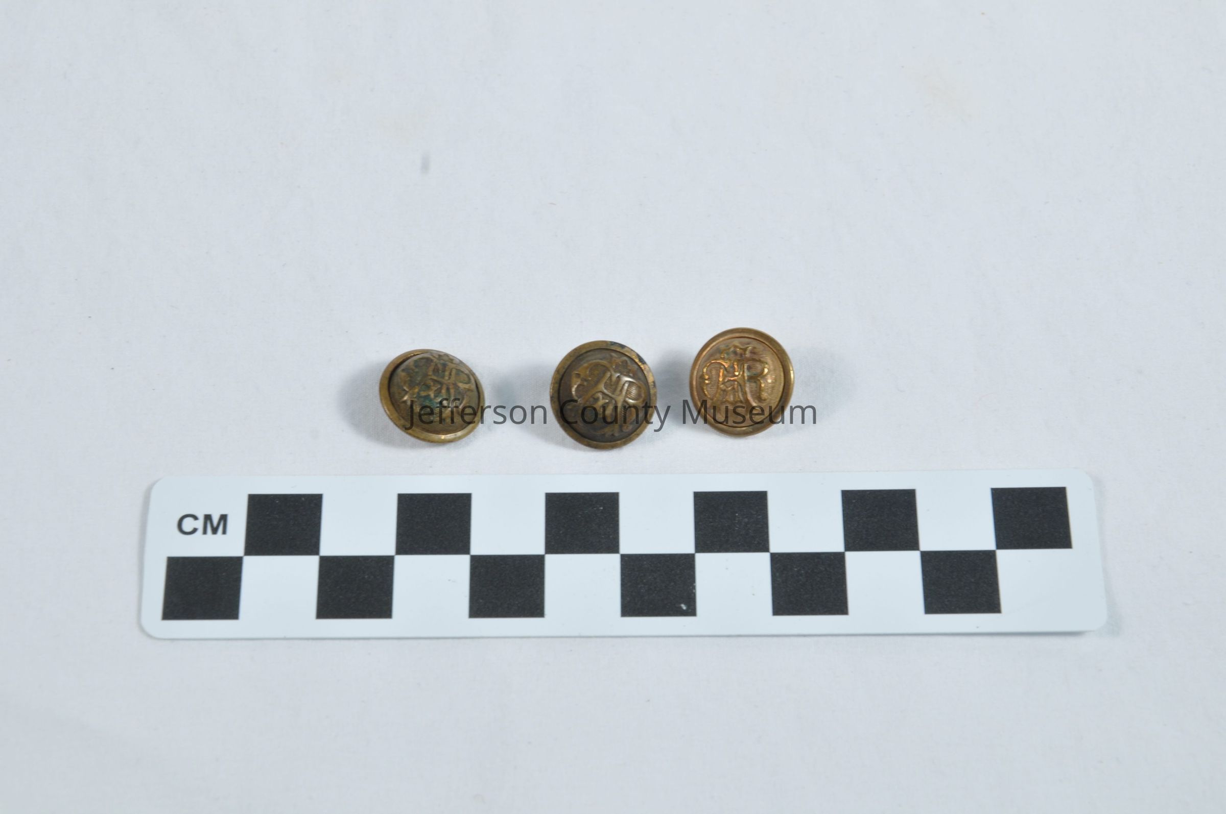 Three brass buttons with the letters "GAR" superimposed. Back of one has "EXTRA QUALITY". Two are unmarked. All have loops.