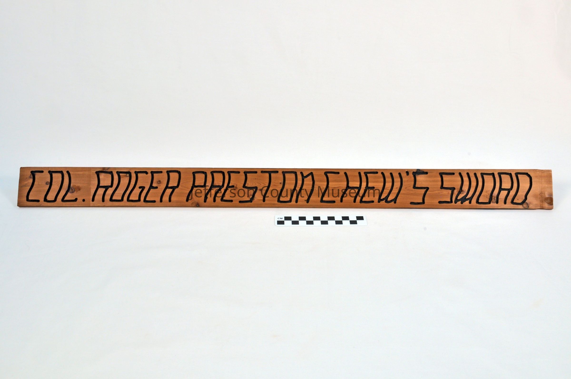 Routed wooden sign with the words "COL. ROGER PRESTON CHEW'S SWORD".