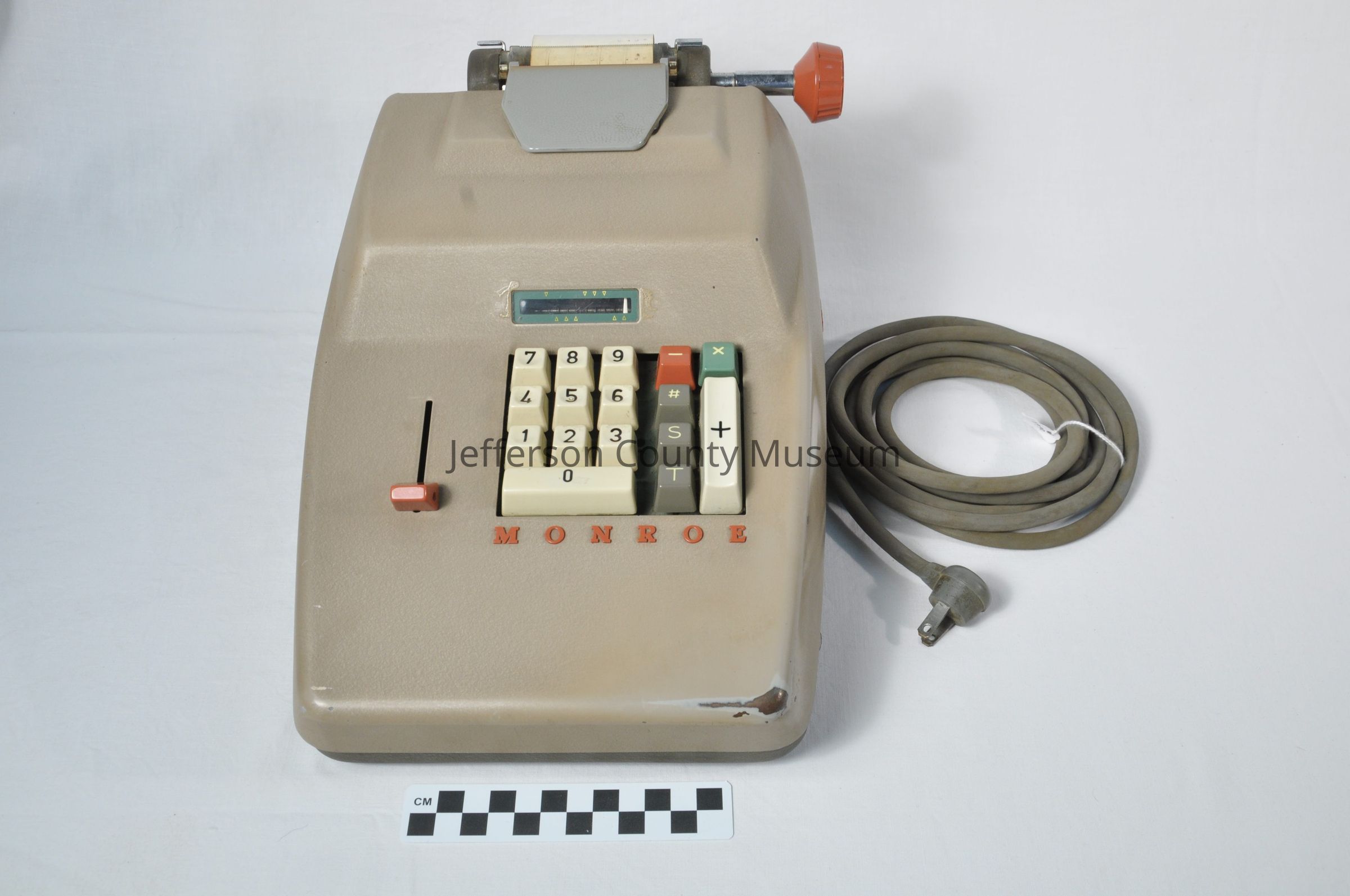 Adding machine with numbers one through zero, a +, -, #, x, S and T key. There is a lever to the left of the keyboard and a small window above the keyboard. There is a roll of paper at the top and a roller handle on the right side of the machine. The word "MONROE" is directly below the keyboard. "MONROE" is also on both sides of the machine. Plate on bottom says "MONROE CALCULATING MACHINE COMPANY, ORANGE, NEW JERSEY U.S.A. MODEL 911 E 11 SERIAL M-69541-D VOLTS - 115 AMPS - 1 CYCLES - 60/DC. Another small plate on bottom says "MADE IN GERMANY". Has three-prong electric cord that plugs into the back of the machine.Acquisition