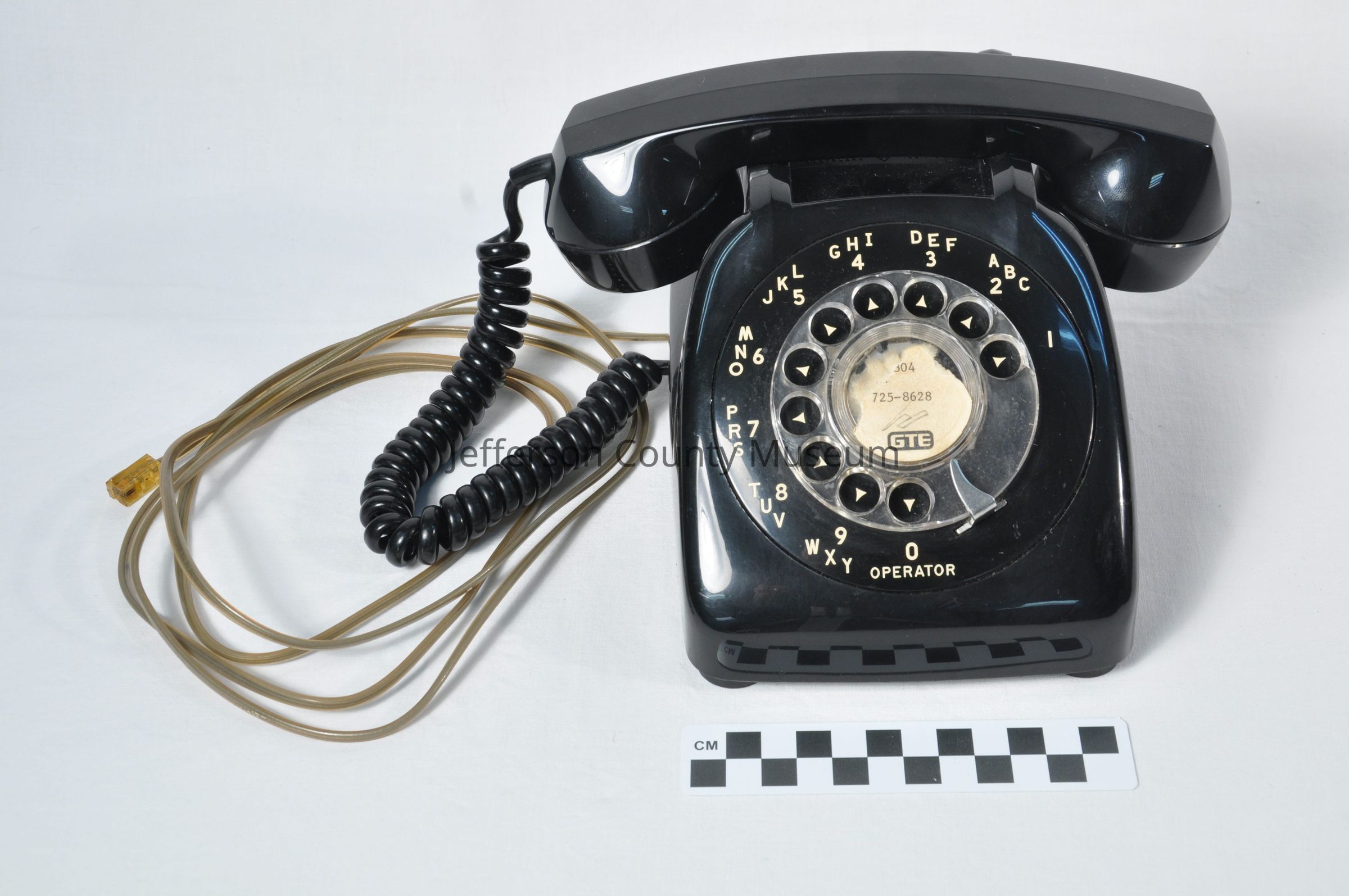 Black plastic desk telephone with rotary dial with numbers one to zero. Above each number starting with 2 going to 9 there are three letters of the alphabet adjacent to each number. There are no letters at the 1 and below the 0 is "OPERATOR". Paper label in the center of the dial has "304-725-8628". Below that is "GTE". Paper sticker on back says "REPAIR ANSWER CENTER To reach repair service, dial 1-606-329-8181 This is a free call." Cord attached. Volume wheel on bottom with arrow and "LOUD".Acquisition