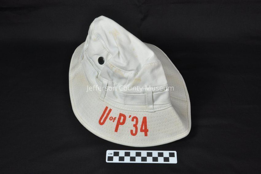 White cotton rain or sun hat sometimes called a "boonie" hat. Four black metal vent holes on crown. Belt type loops form a band around hat. Printed on front in red "U of P '34". Label inside says "100% COTTON SIZE: M MADE IN CHINA".Acquisition