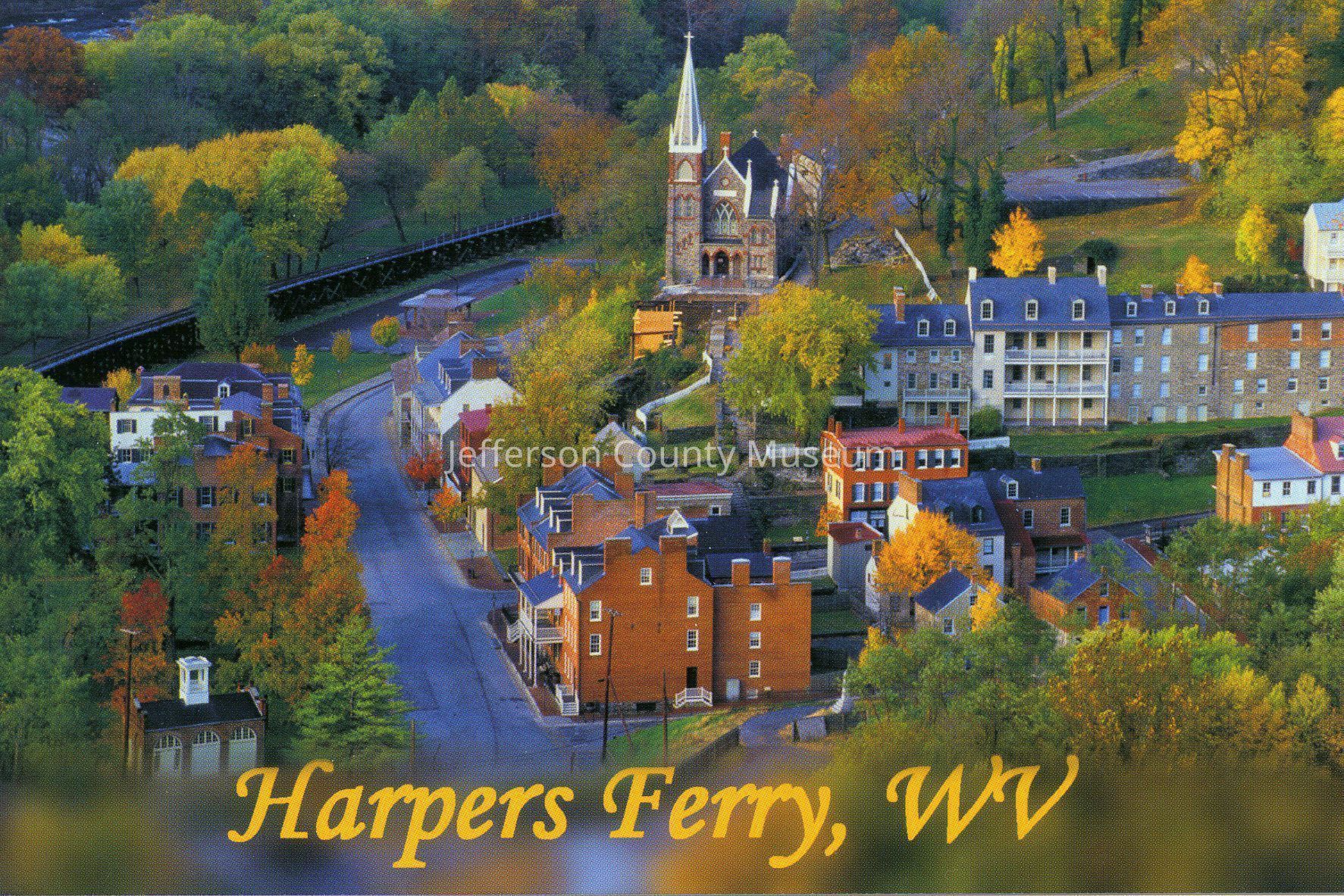 Harpers Ferry in the early fall, taken from across the Potomac River. Printed in yellow script along the lower edge: "Harpers Ferry, WV".Acquisition
