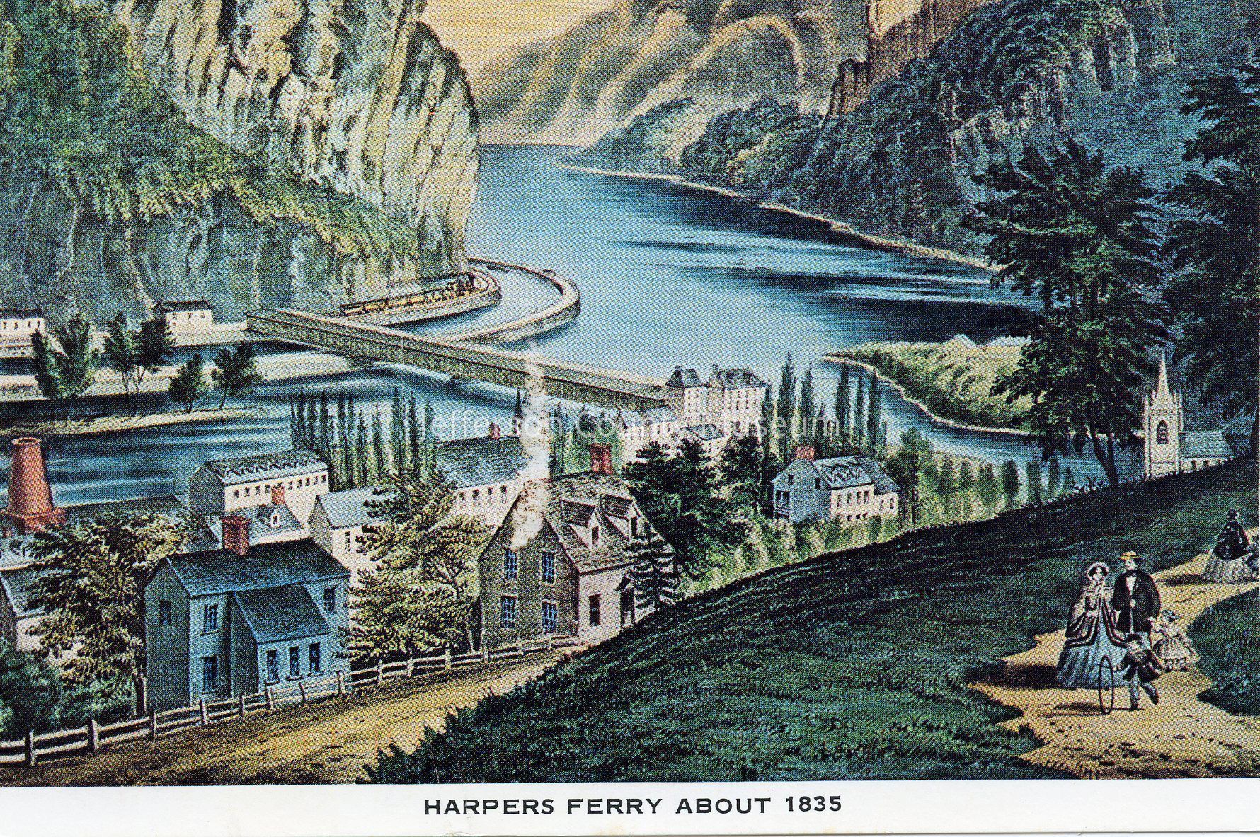 Unidentified artist's rendering of Harpers Ferry showing the lower town and the confluence of the Potomac and Shenandoah rivers. Postmarked Martinsburg, 2010. Addressed to Mr. John DeGursa (sp?).Acquisition
