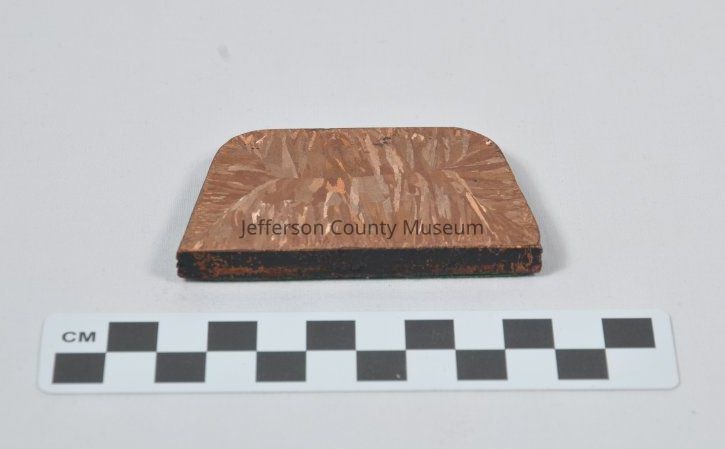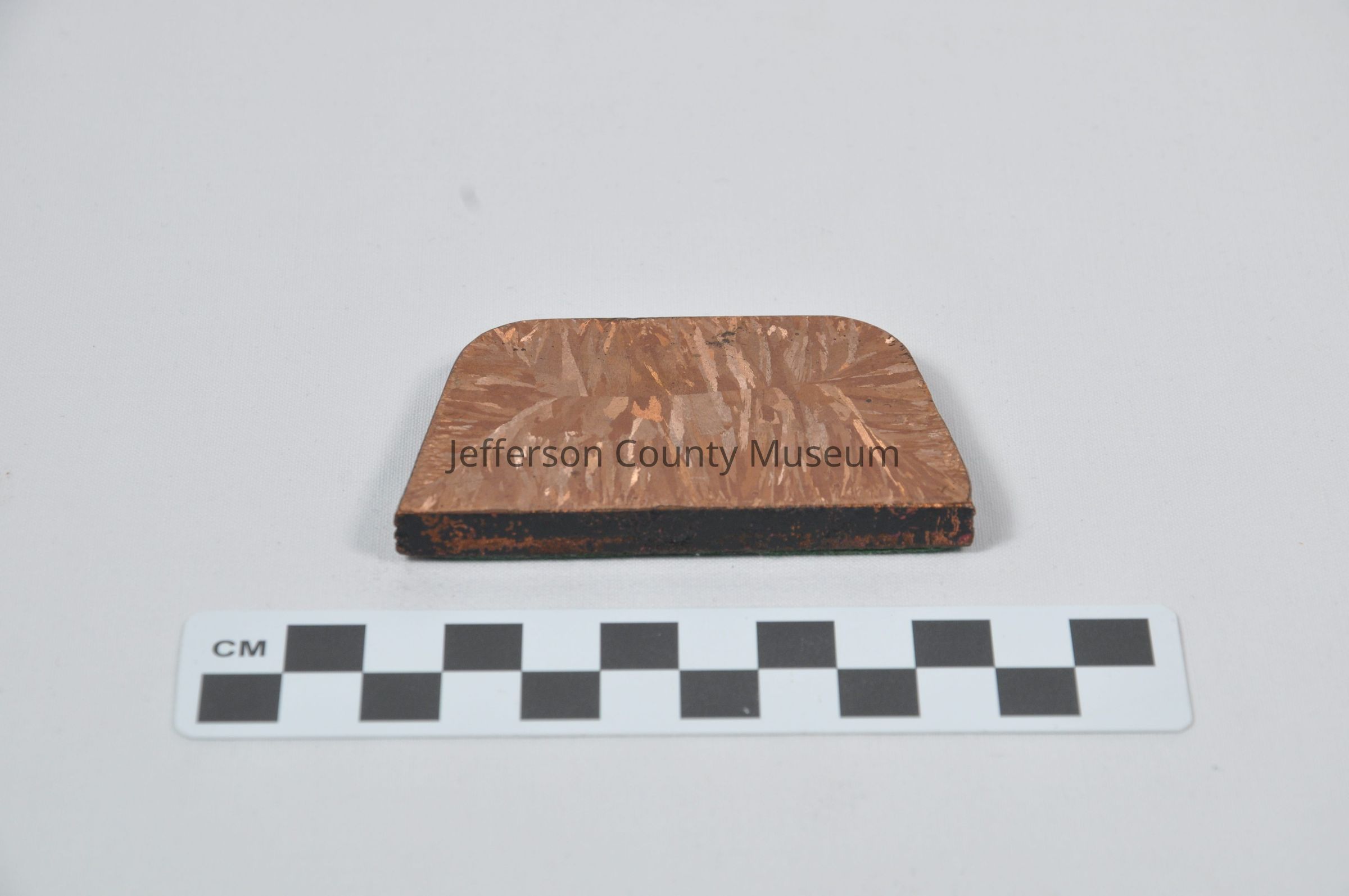 Metal paperweight with green felt on bottom. Metal is copper colored and has the appearance of galvanization. It is not quite rectangular in shape with two corners rounded and two corners at right angles.Acquisition
