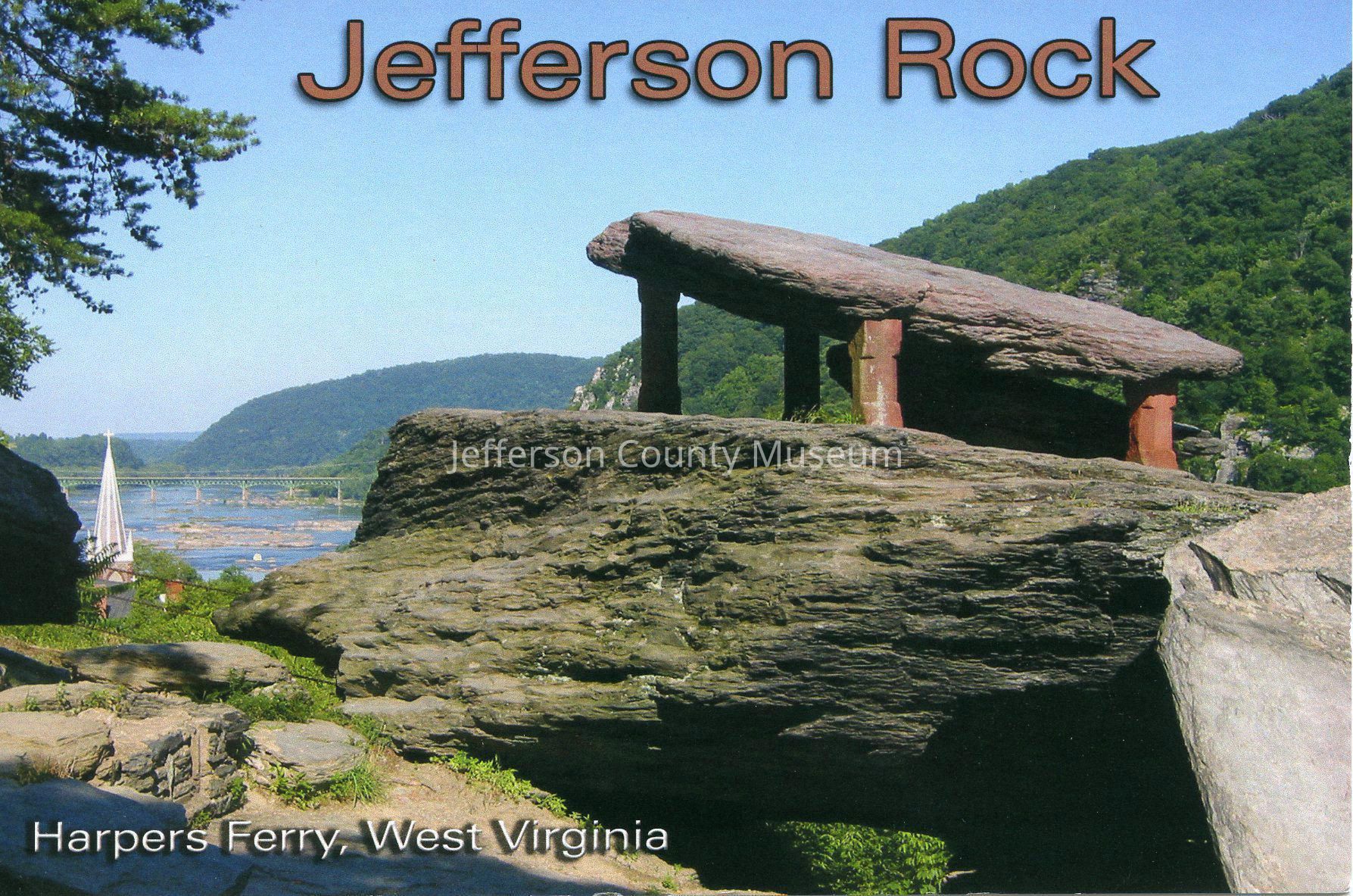 Jefferson Rock looking toward the gap. Printed in brown along upper edge: "Jefferson Rock". Printed in white in lower left corner: "Harpers Ferry, West Virginia".Acquisition