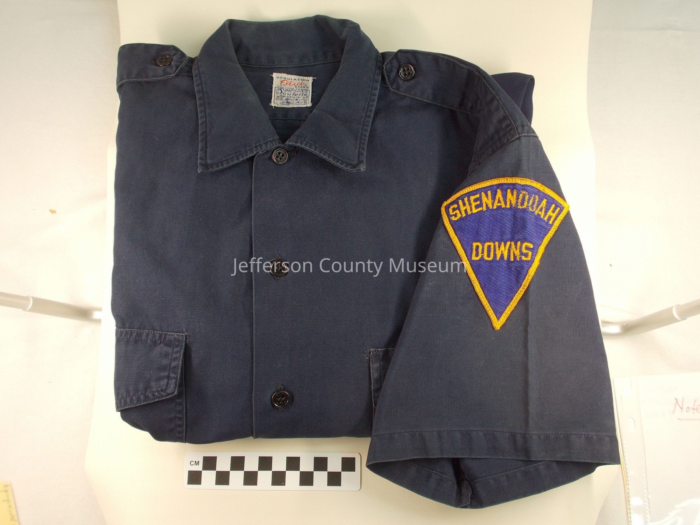 Shirt worn by a guard at Shenandoah Downs racetrack (race track) in Charles Town. Short-sleeved dark blue shirt with a breast pocket on either side. Five black four-holed buttons and six buttonholes down the front of the shirt (one button missing). Each pocket with a flap that buttons with a four-hole black button to the upper part of the pocket. Black-buttoned epaulet on each shoulder. Above left pocket on inside is a loop, perhaps to hold a badge. Patch on left sleeve with blue background on which "Shenandoah Downs" is embroidered in gold thread and with gold thread embroidered around the edges of the patch. Patch is shaped like a 60-degree segment of a circle, with two straight sides from center (at bottom of patch) to an arc which forms the top of the patch.Acquisition