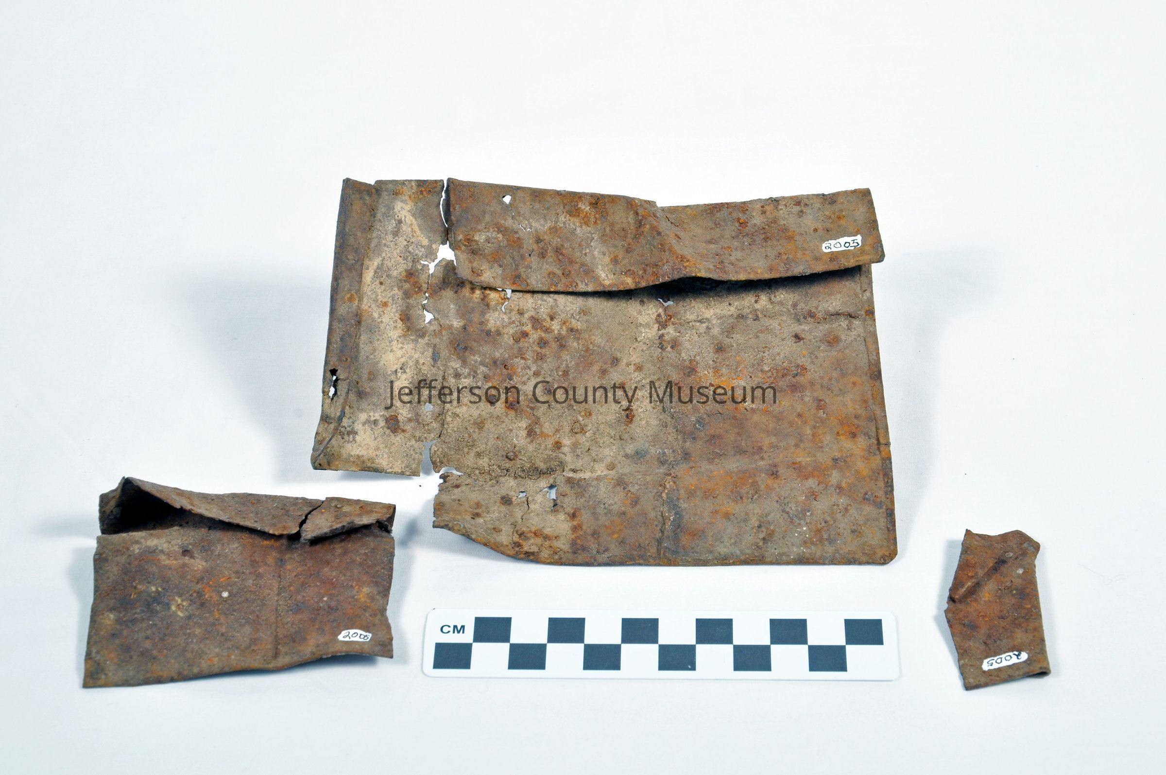Civil War tin cartridge box liner for keeping cartridges separated inside leather cartridge box; excavated by Jim Glymph at Fort Donelson, Tennessee; very poor condition: rusted and in three pieces.Acquisition