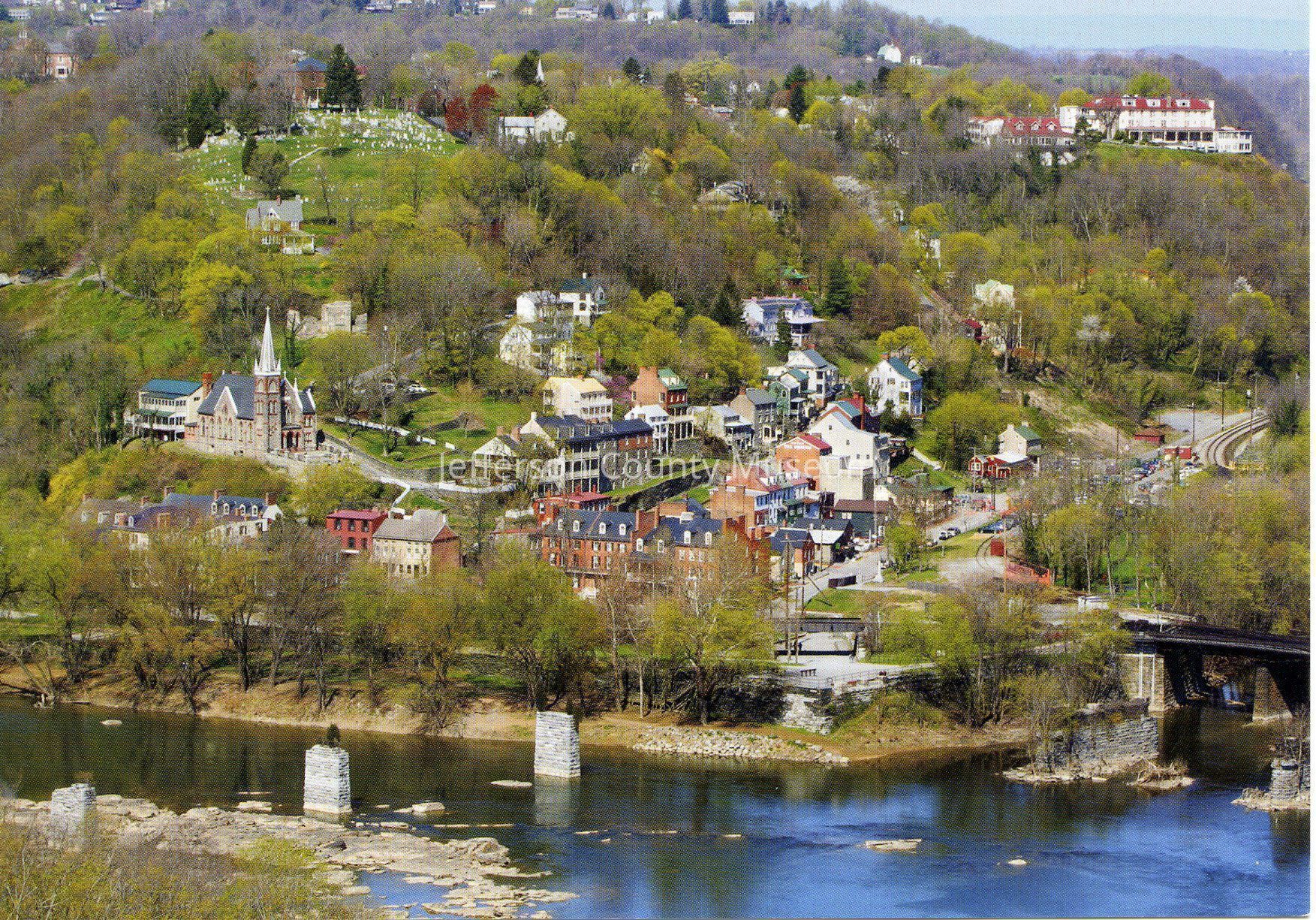 Harpers Ferry, W.Va. taken from Loudoun Heights, showing the Shenandoah River, the lower town, St. Peter's Catholic Church, Harper Cemetery, and the Hilltop House Hotel.Acquisition
