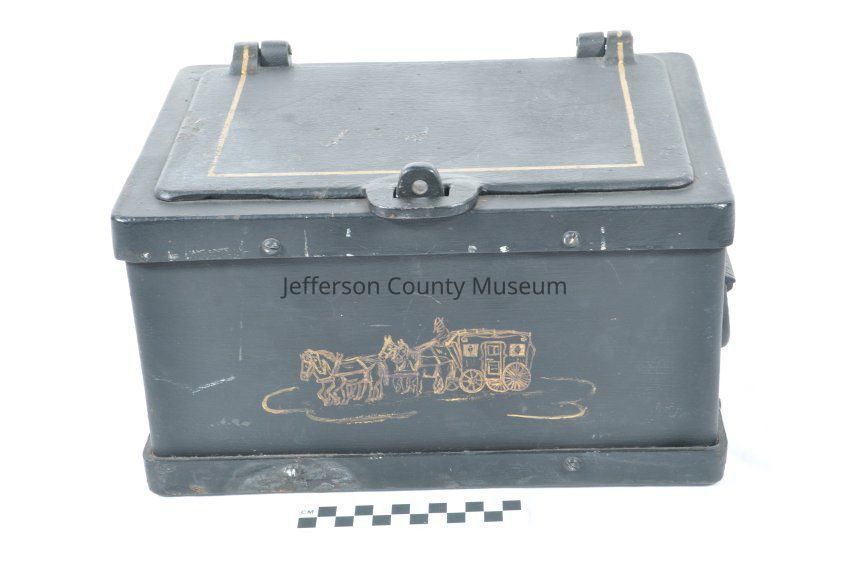 On the front side of the safe is a gold-painted drawing showing a four-wheeled stagecoach with a door and two curtained windows being pulled by four horses. Holding the reins is a driver with a cowboy hat.Acquisition