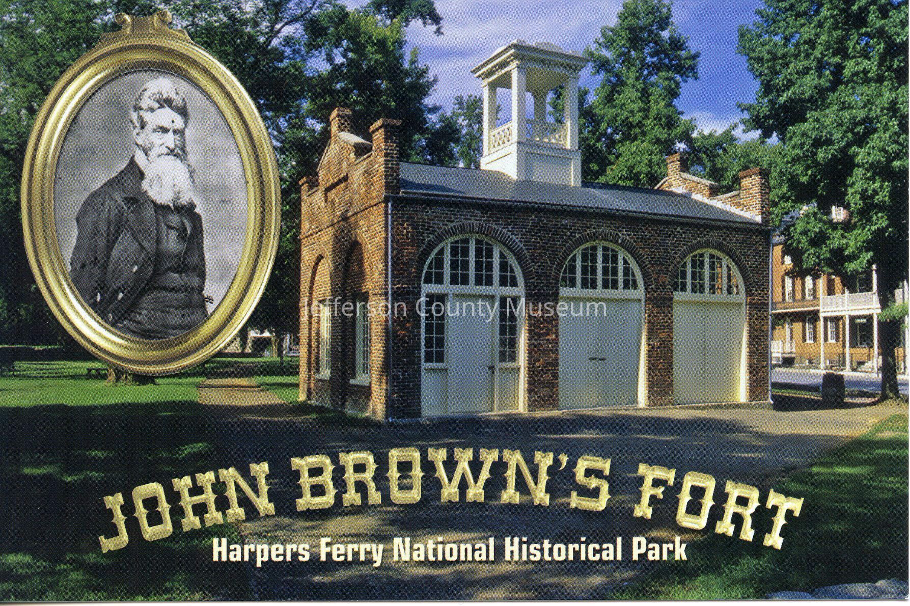 John Brown's fort set in the lower town, with inset picture of John Brown in the upper left corner. Printed in gold below picture of fort: "JOHN BROWN'S FORT"; printed in white along lower edge: "Harpers Ferry National Historical Park".Acquisition