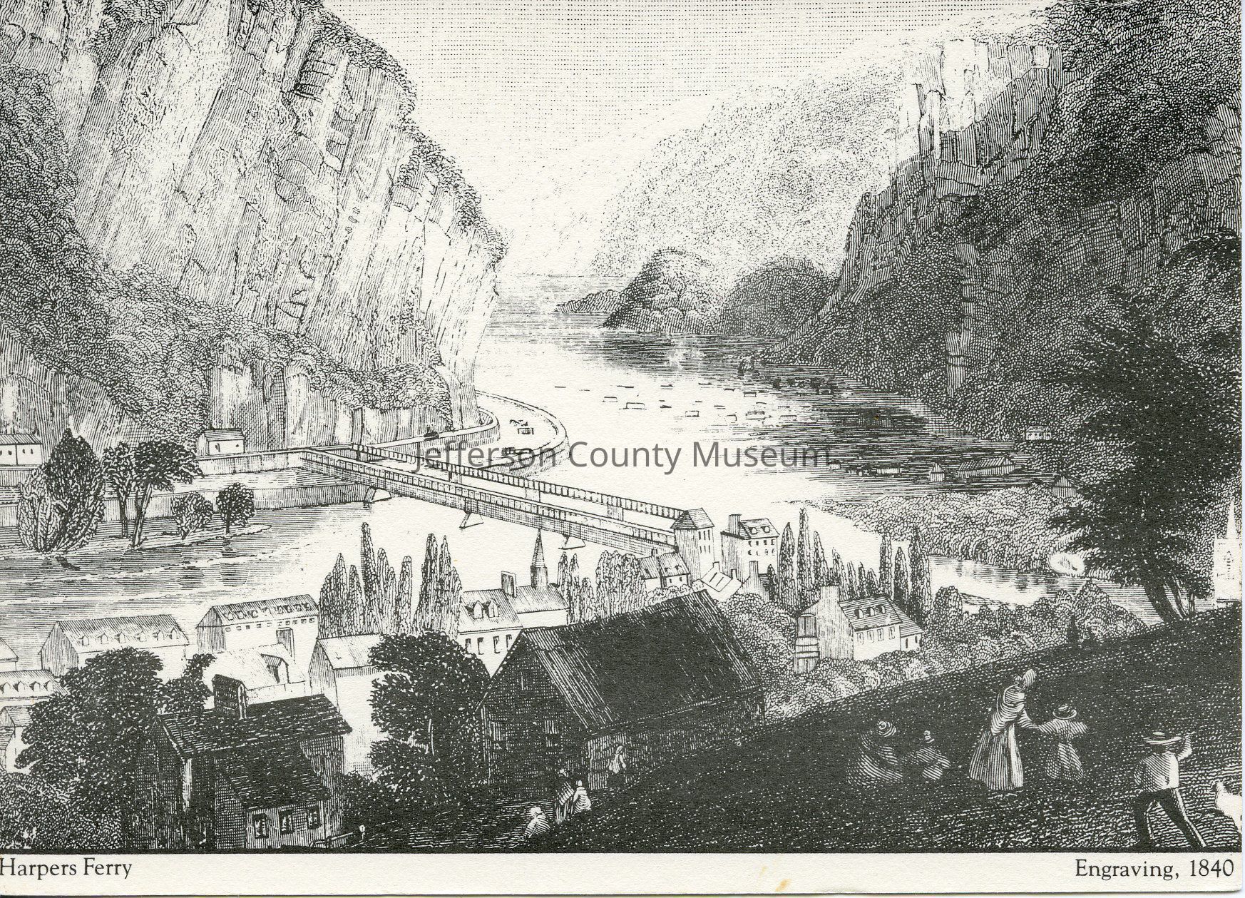 Harpers Ferry taken from an 1840 engraving by Wm. Bartlett, showing the town and the railroad bridge before the Civil War.Acquisition