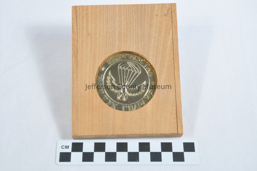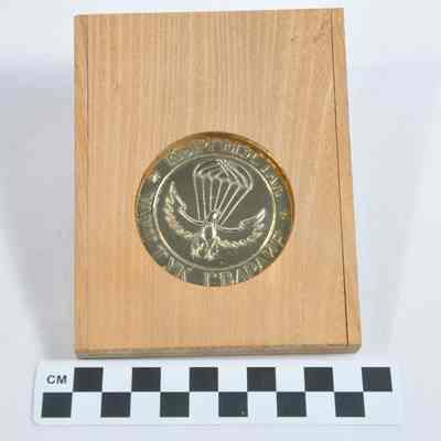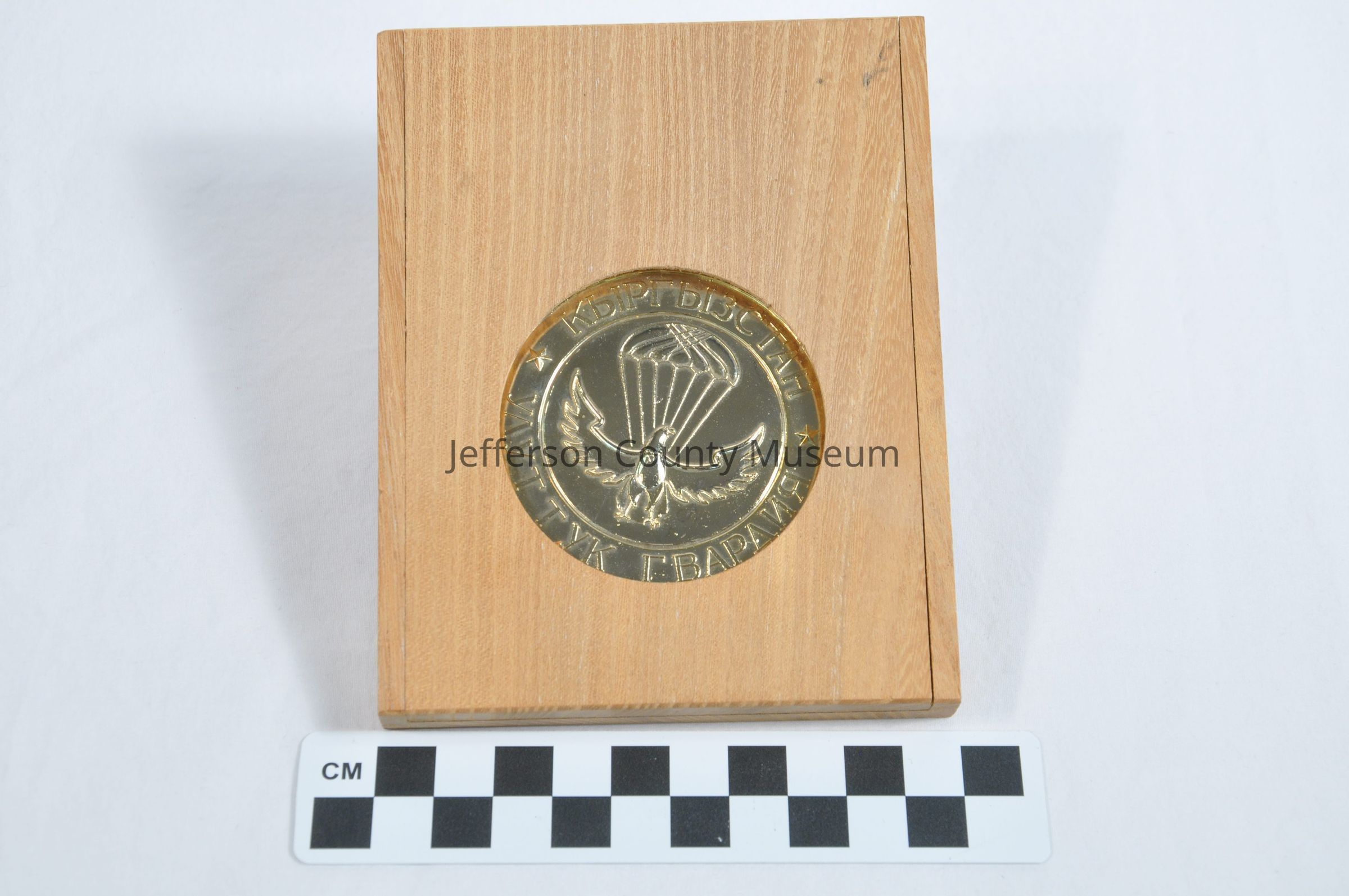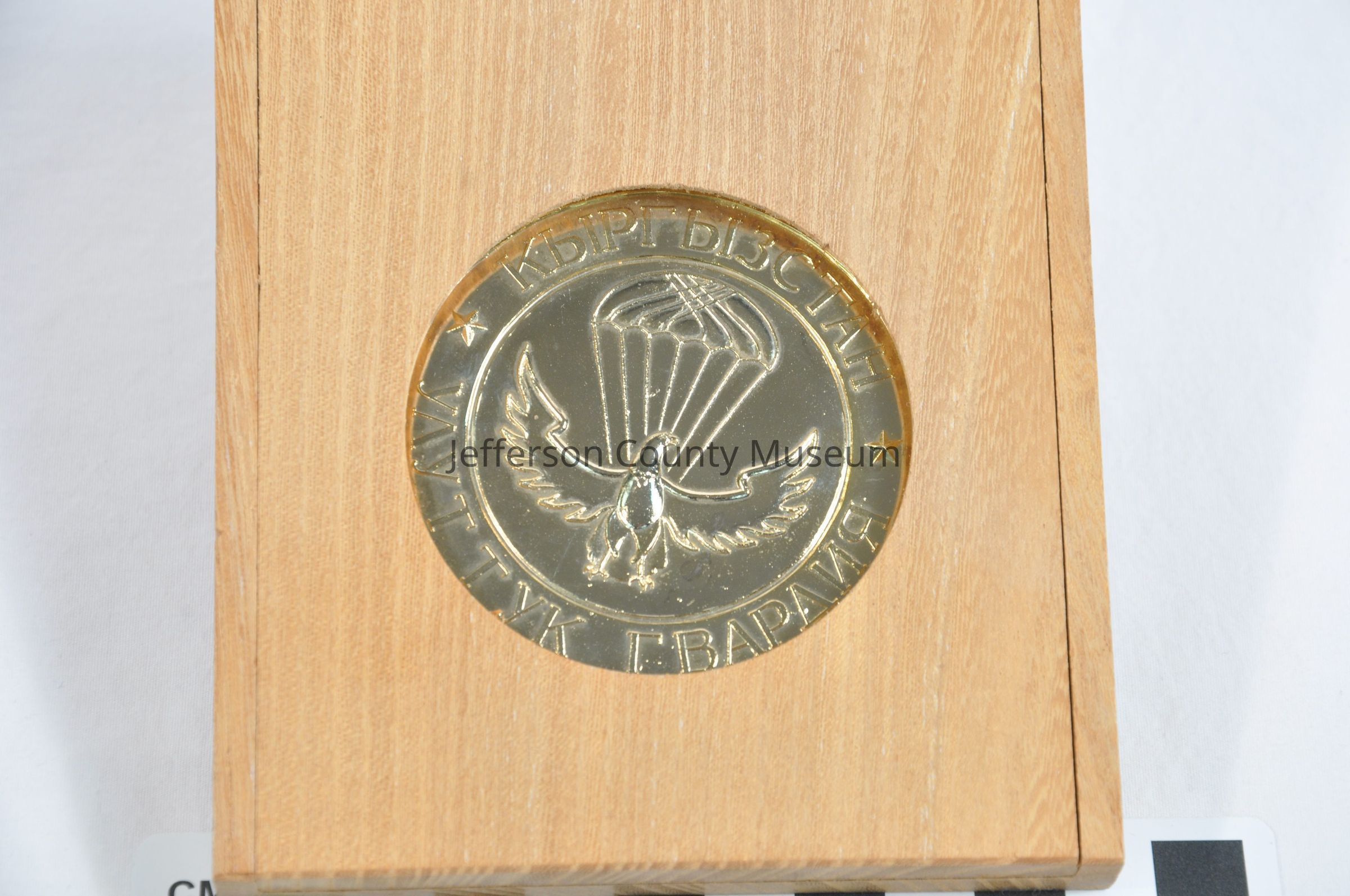 Gold colored coin or medal in flip-up wooden display box. Cyrillic writing around edge on both sides. On the obverse is a spread-winged eagle with a parachute above it. On reverse is a spread-winged eagle with mountains and a rising sun behind it. Probably given by the Kyrgz Republic.Acquisition