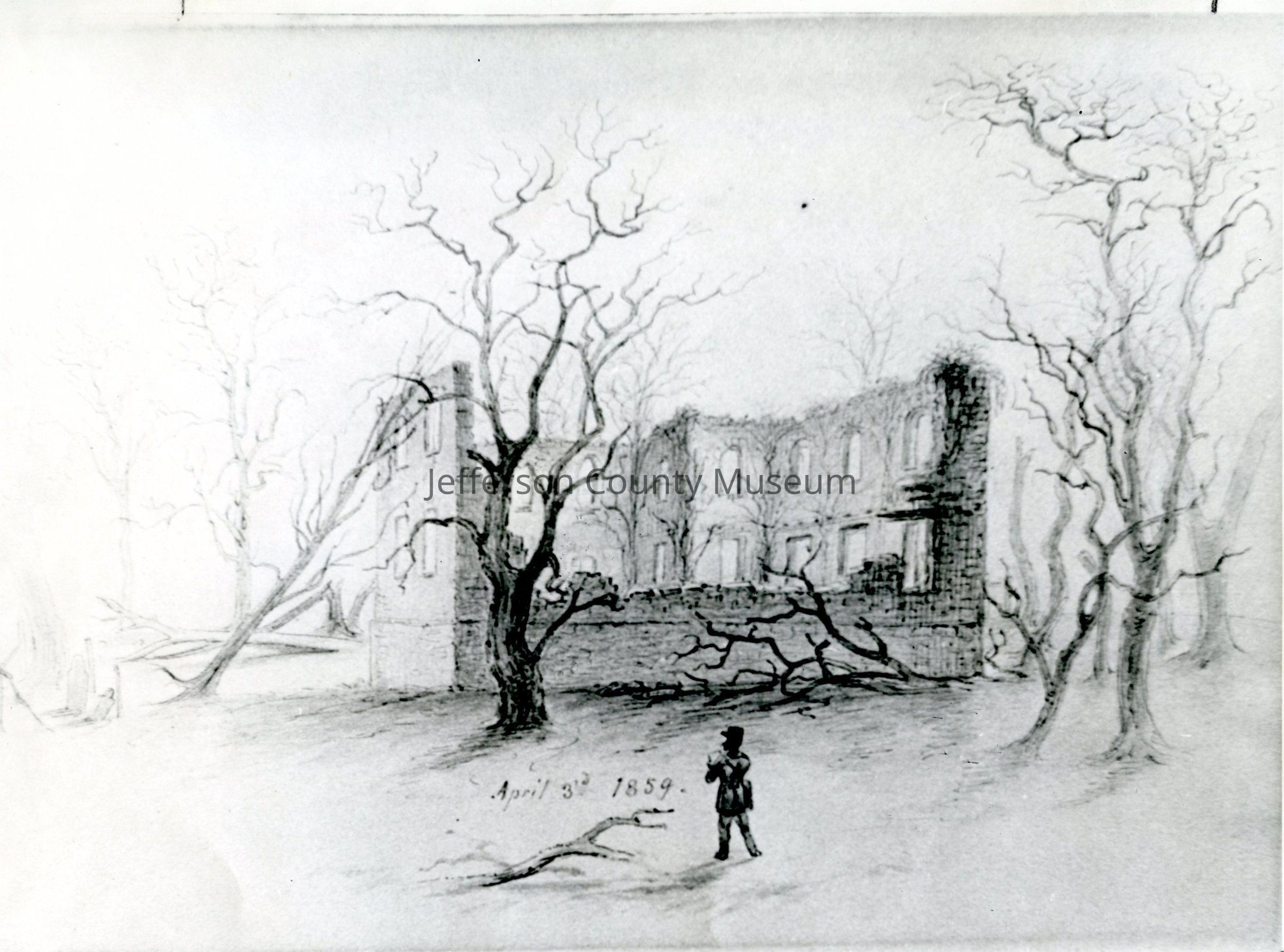 Enclosure says: "Drawing dated 1859. Obviously the west wall was the first to collapse. The interior beam located just above the lower south windows shows mortises for timbers which supported the gallery."Acquisition