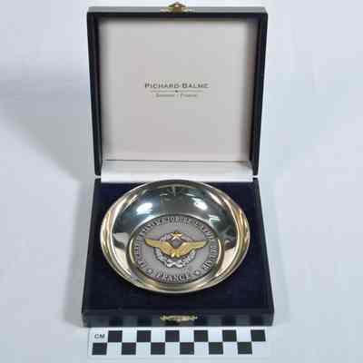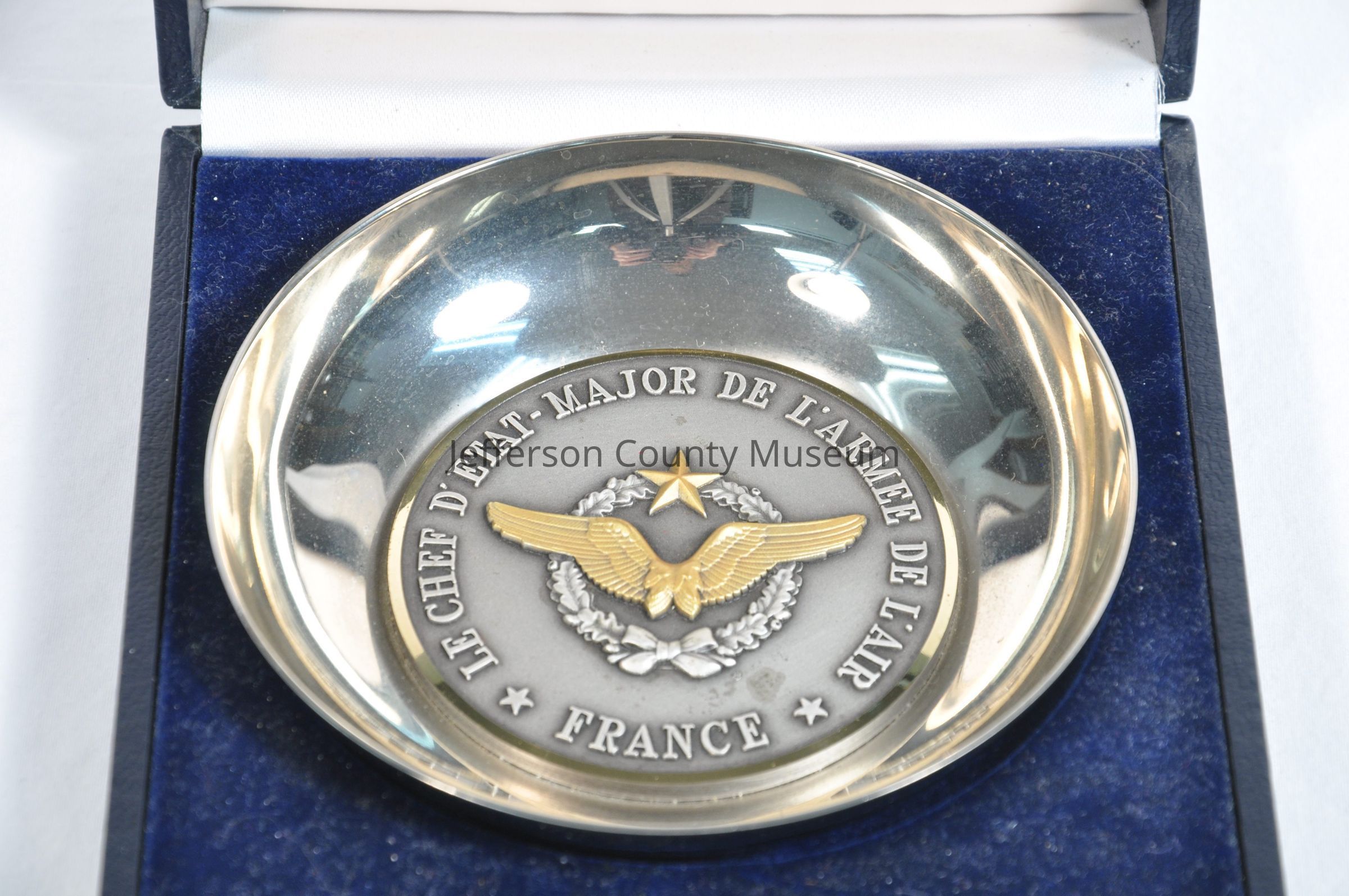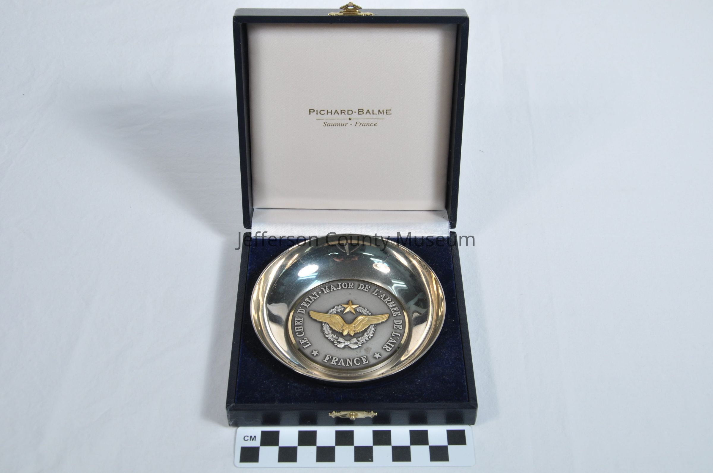 Silver colored bowl with round medal in bottom of bowl in black presentation box. In center of medal is a gold colored spread-winged eagle with a gold star above superimposed over a silver wreath. Around the edge of the medal is "LE CHEF D'ETAT-MAJOR DE L'ARMEE DE L'AIR FRANCE"