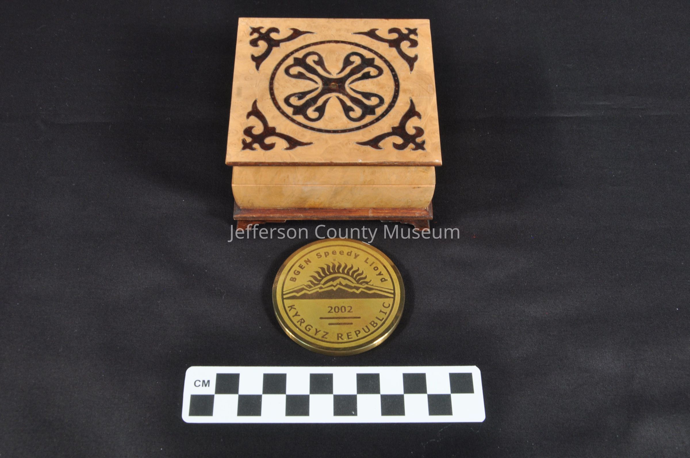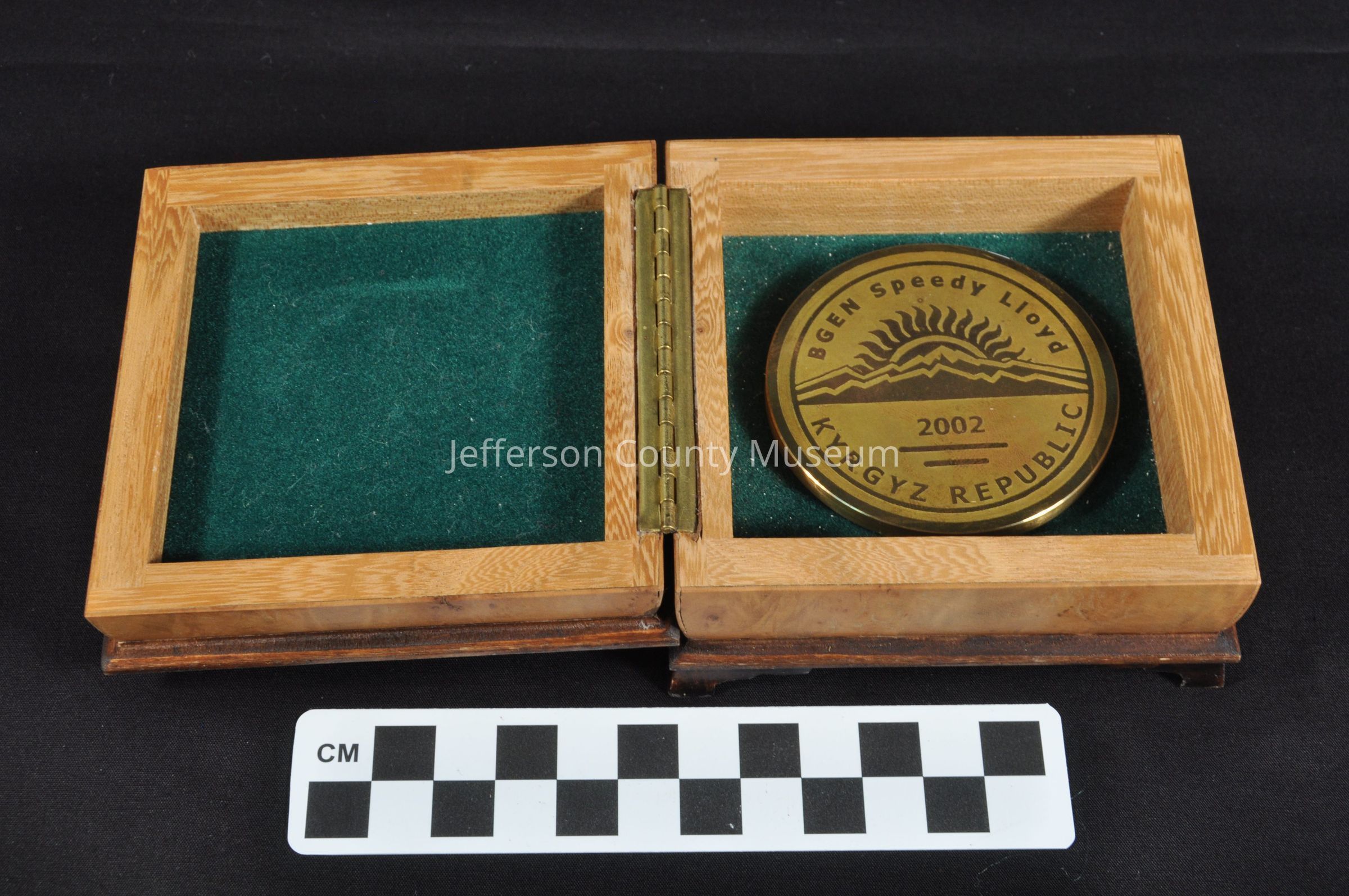 Bronze colored medal or coin in wooden presentation box. On Obverse is "BGEN Speedy Lloyd KYRGZ REPUBLIC 2002". Mountains with a rising sun behind is in center. Reverse has four connected fleur-de-lis with 'U. S. EMBASSY BISHKEK around edge. Box has inlaid designs on top with four short pedestal legs.Acquisition