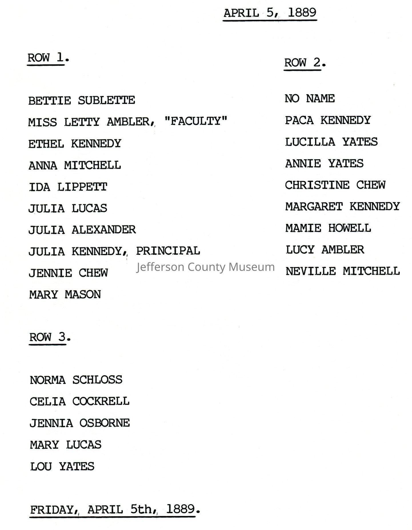 School group portrait, Friday, April 5, 1889. Miss Letty Ambler - faculty; Julia Kennedy - principal.