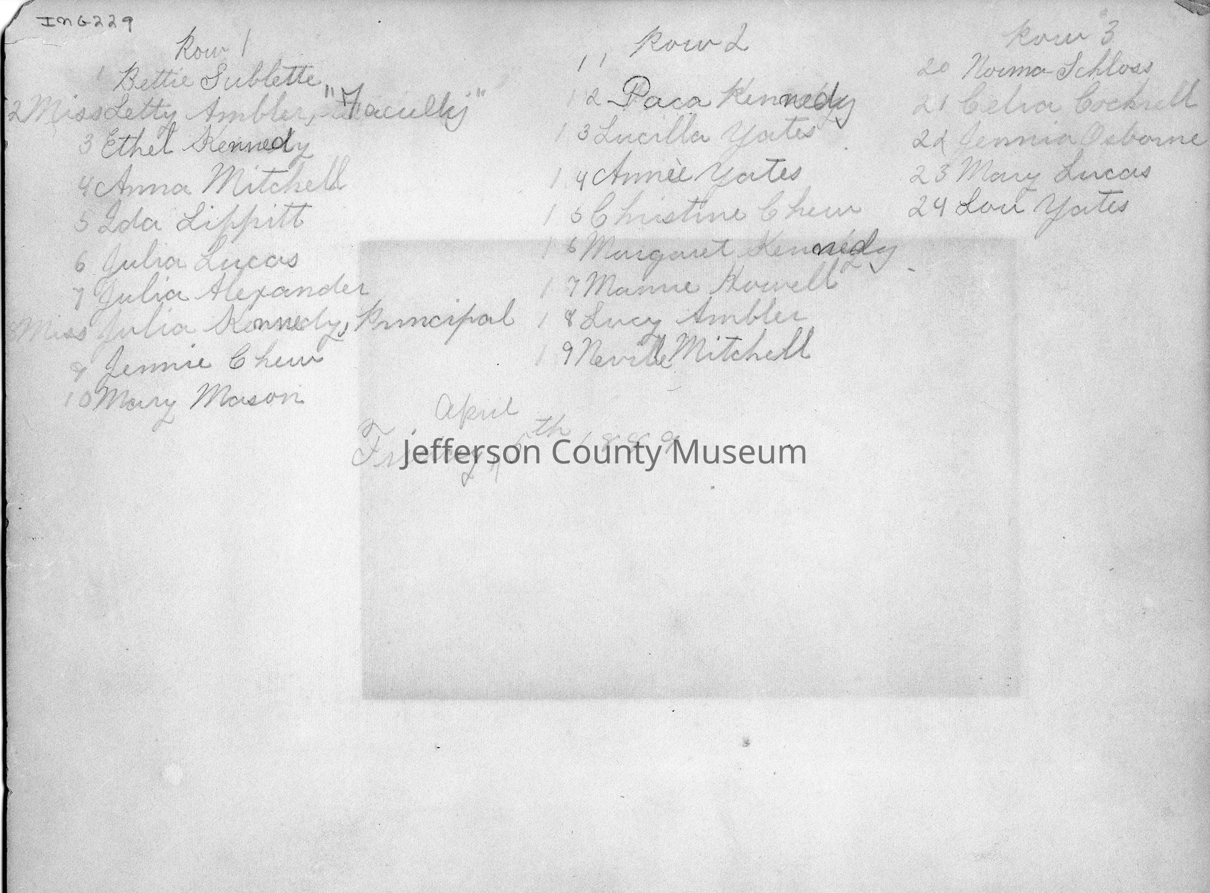 Names of students/adults are written by row on the back of the photograph. See additional images.Acquisition