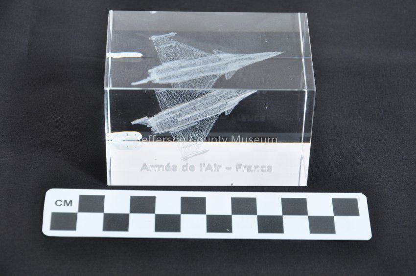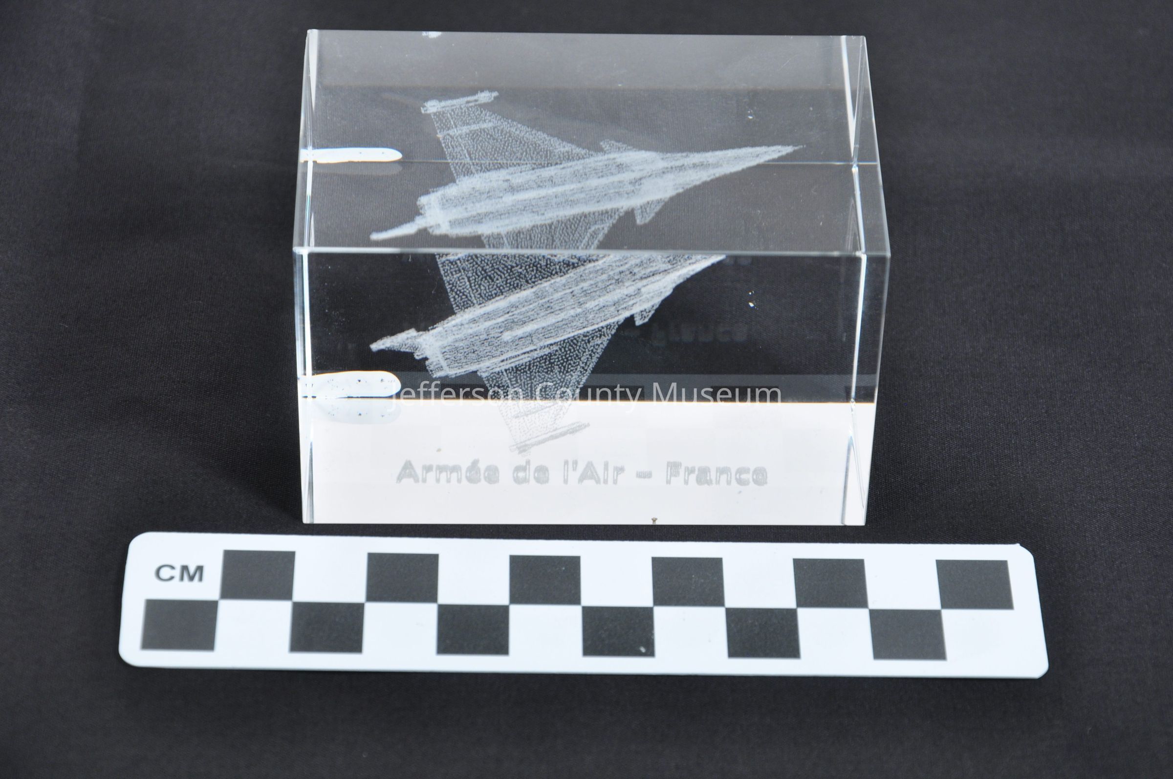 Rectangular lucite block with the image of the fighter jet Raphael embedded. Also embedded are the words "Armee de l'Air - France".Acquisition
