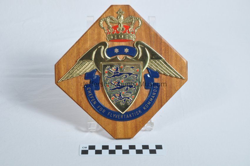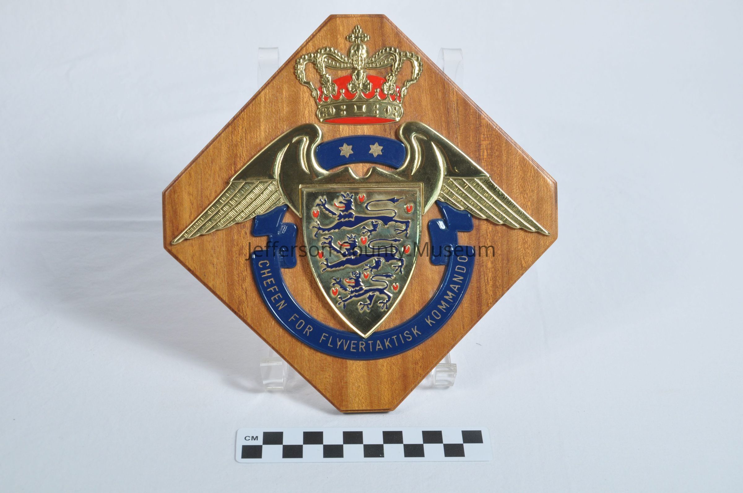 Rectangular wooden plaque. Mounted on the plaque are a gold colored crown with a red head piece. Below the crown are spread wings with a shield with three blue lions. On a banner below the shield are the words "CHEFEN FOR FLYVERTAKTISK KOMMANDO". Taped on back is a label saying "On the occasion of the visit of Commander Tactical Air Command Denmark at c Manas, June 2002". Label on back at bottom reads "FREMSTILLET VED HOVEDVAERKSTED VAERLOSE".Acquisition