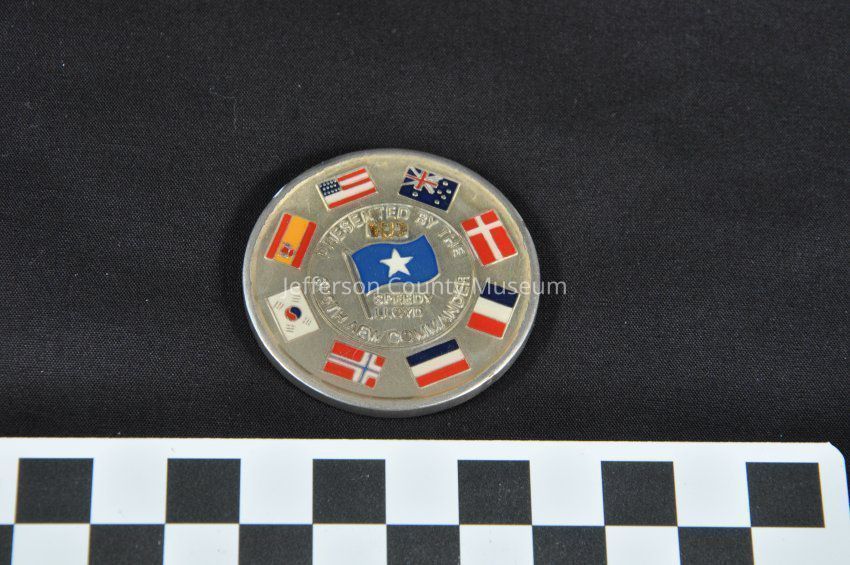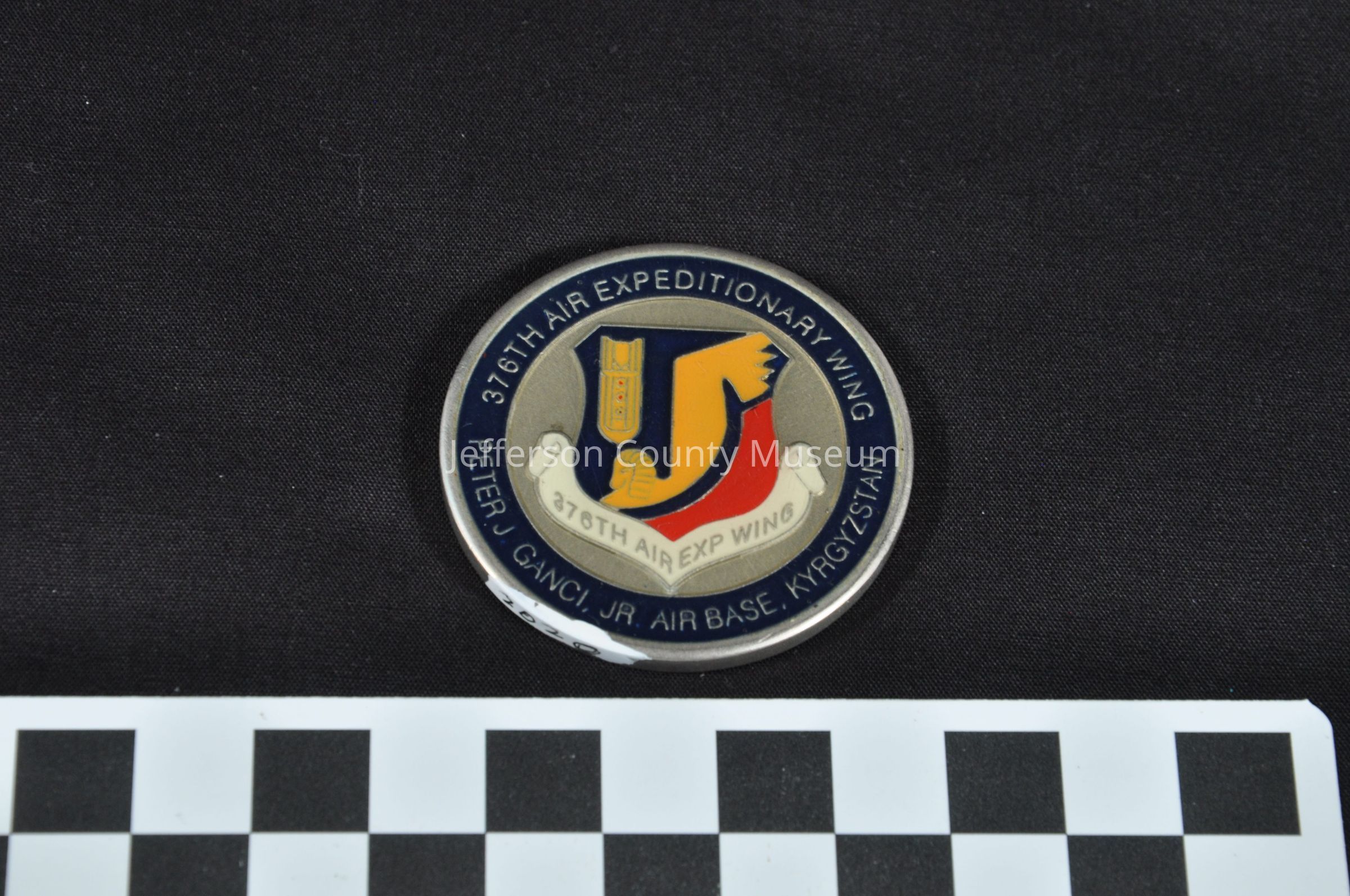 Air Force coin of excellence.The obverse side has these words around the edge on a dark blue or black background: "376TH AIR EXPEDITIONARY WING PETER J. GANCI AIR BASE KYRGYZSTAN". In the center is a red, yellow and dark blue or black shield with a white banner below with these words: 376TH AIR EXP WING". On the reverse, in color are the eight flags of the coalition countries participating in operation Enduring Freedom. In the center is the blue NATO flag with a single white star. Around the flag are the words "PRESENTED BY THE 376TH AIR WING COMMANDER SPEEDY LLOYD".Acquisition