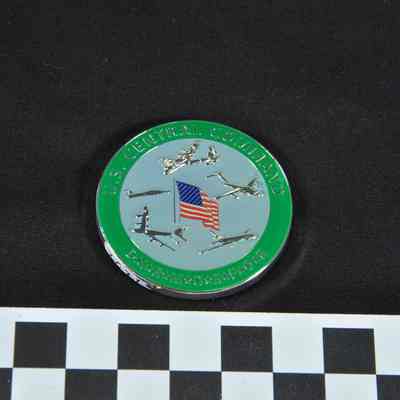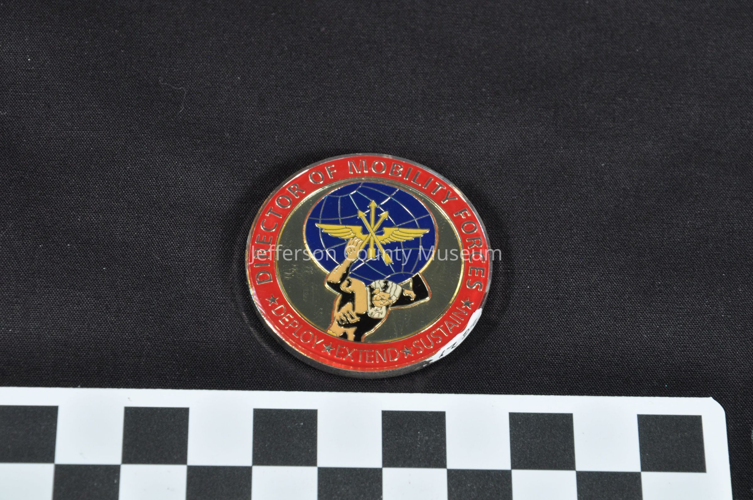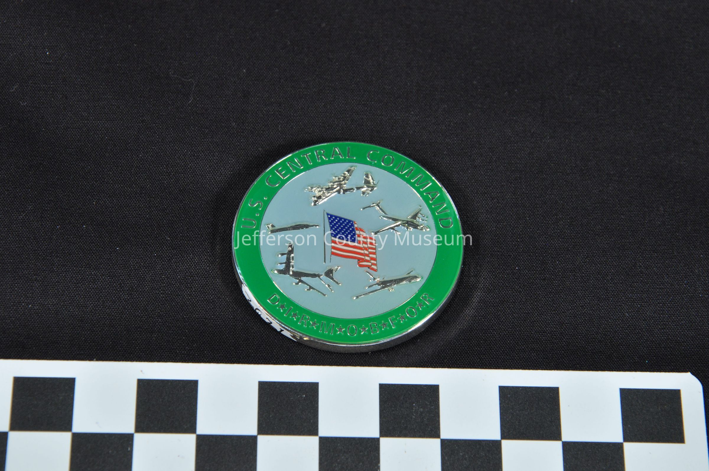 Military coin of excellence. Obverse has American flag in center surrounded by five different types of aircraft. Around the edge in gold on a green background is "U.S. CENTRAL COMMAND". At bottom are these letters separated by stars "D I R M O B F O R". Reverse has a blue globe in center with wings, three arrows and a hand superimposed. Around the edge in gold on a red background is "DIRECTOR OF MOBILITY FORCES DEPLOY EXTEND SUSTAIN".Acquisition