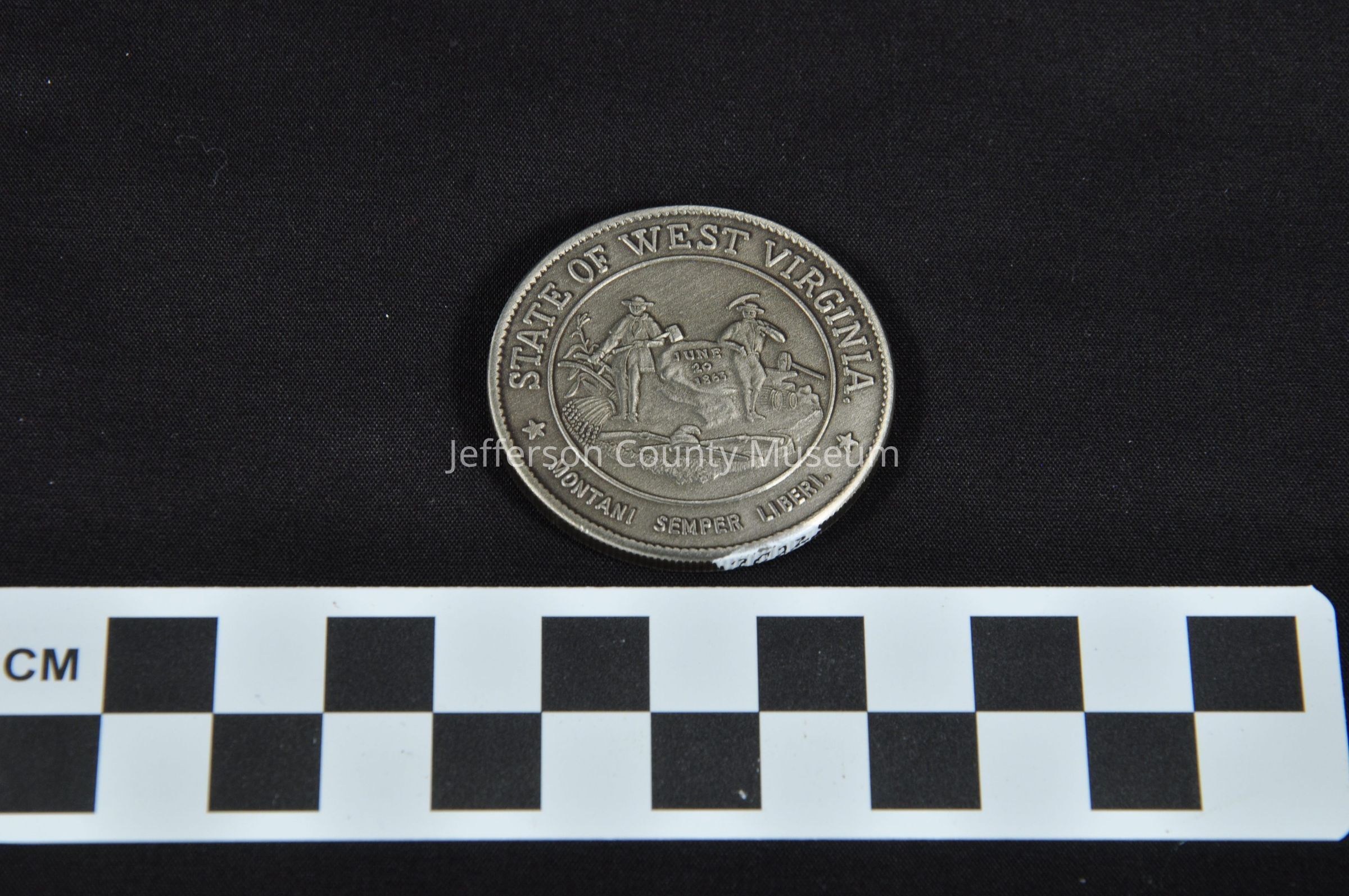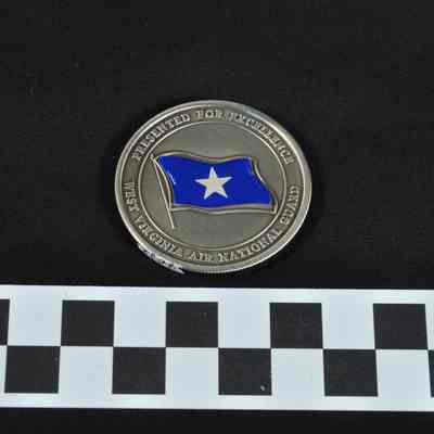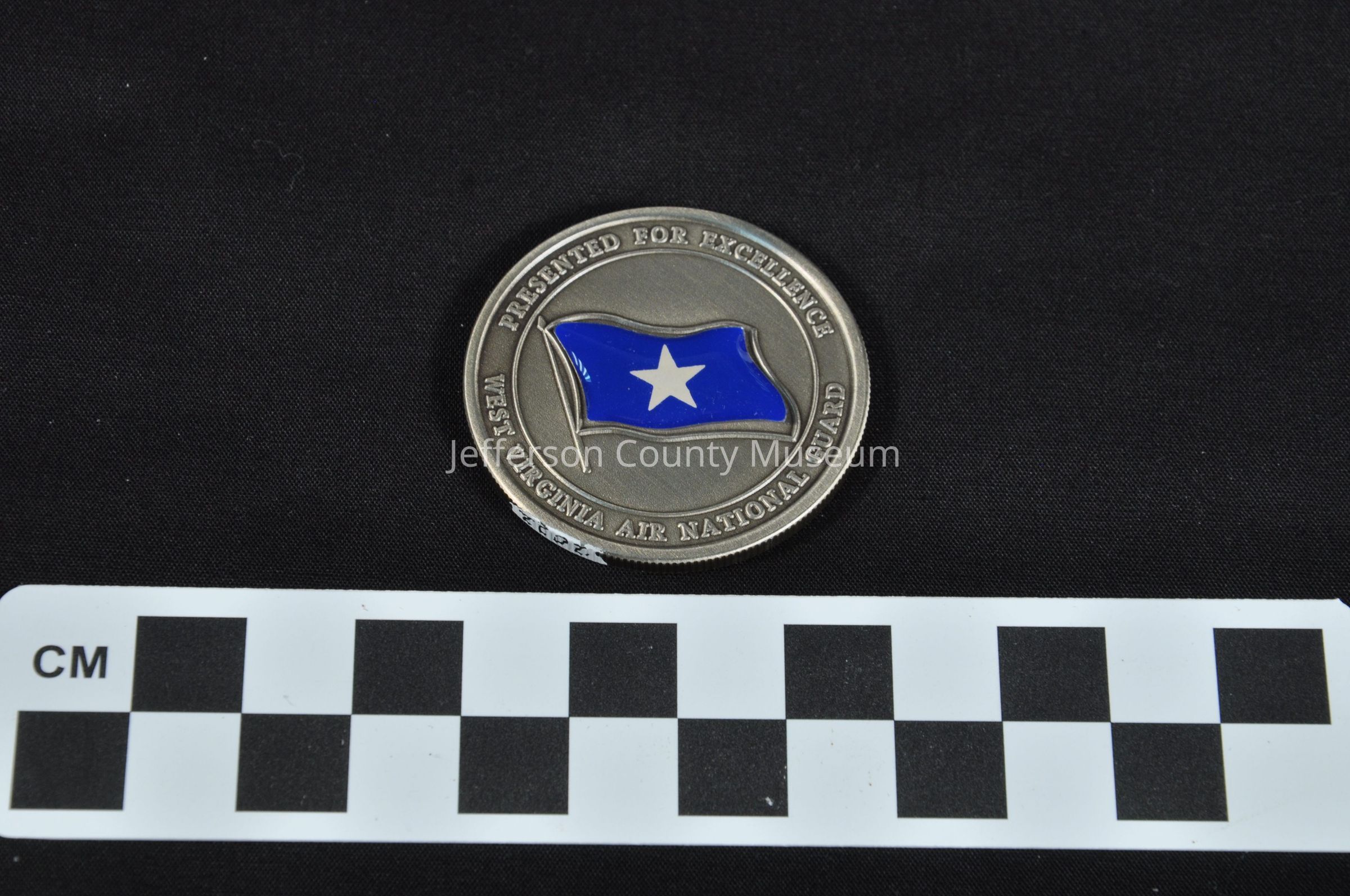 Military coin of excellence. Silver colored coin a with flag in center of obverse. Flag has a blue field with one white star. Around the edge is "PRESENTED FOR EXCELLENCE WEST VIRGINIA AIR NATIONAL GUARD". Reverse has seal of the state of West Virginia surrounded by "STATE OF WEST VIRGINIA MONTANI SEMPER LIBERI".Acquisition