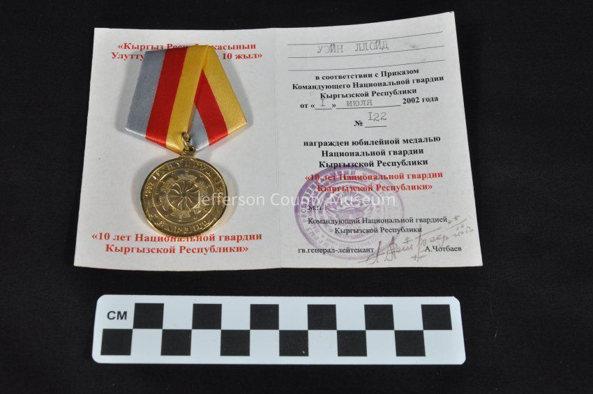 Gold colored medal with Cyrillic writing on both sides. Dates on the obverse are "1992 2002". The medal is hanging from a pentagonal silver, red and yellow ribbon. Along with the medal is a card all in Cyrillic probably describing the medal.Acquisition
