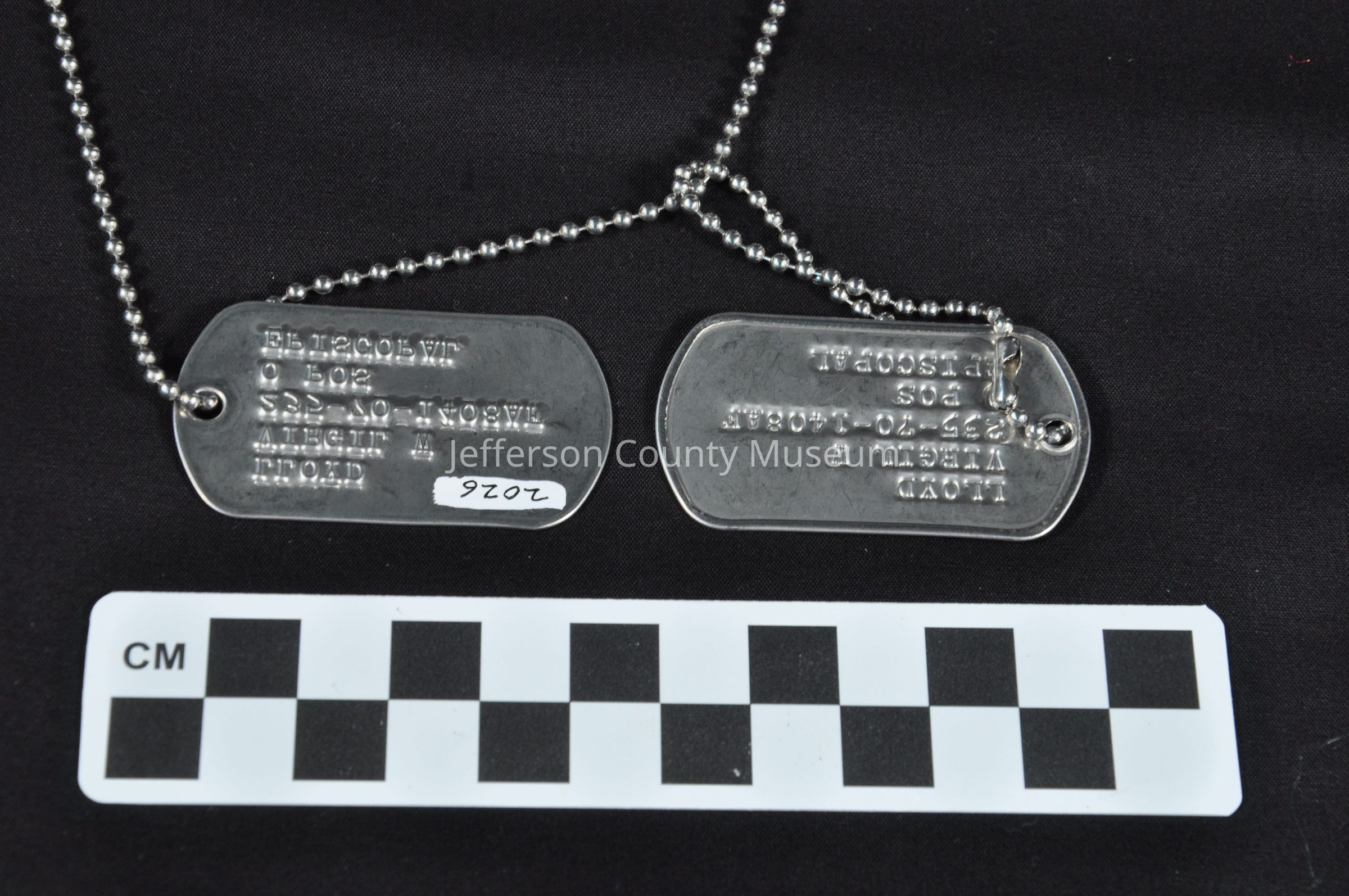 Two metal dog tags. One is attached to a long chain. The other is attached to a short chain hanging from the long chain. On each tag is stamped "LLOYD VIRGIL W 235-70-1408AF O POS EPISCOPAL".Acquisition
