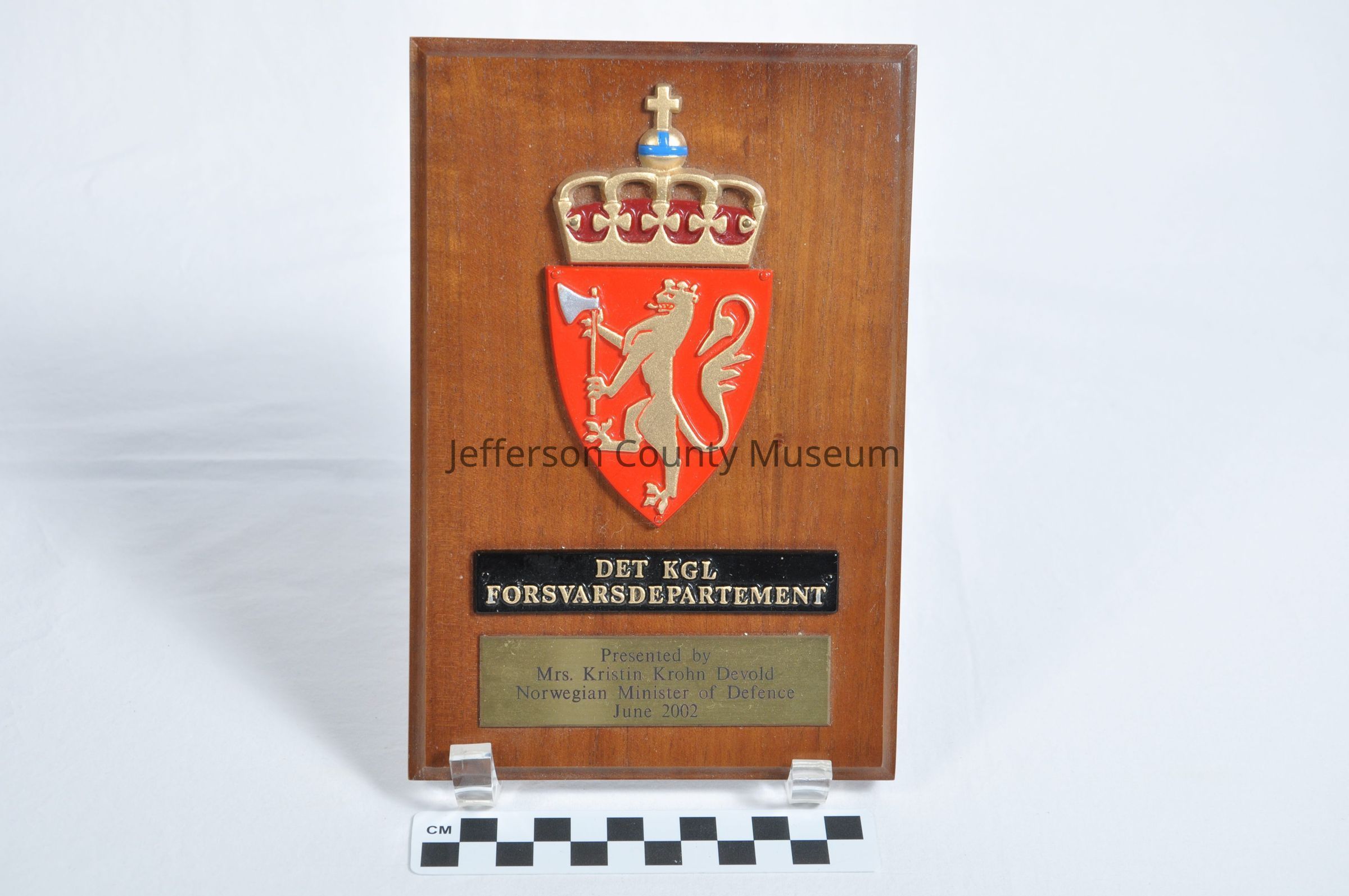 Wooden plaque with the coat-of arms of Norway consisting of a crown with a cross on top, a gold standing lion holding an axe on a red shield. Below the coat-of-arms is a black label with gold lettering: "DET KGL FORSVARSDEPARTEMENT". Below that is a gold colored label with "Presented by Mrs Kristin Krohn Devold Norwegian Minister of Defence June 2002".Acquisition