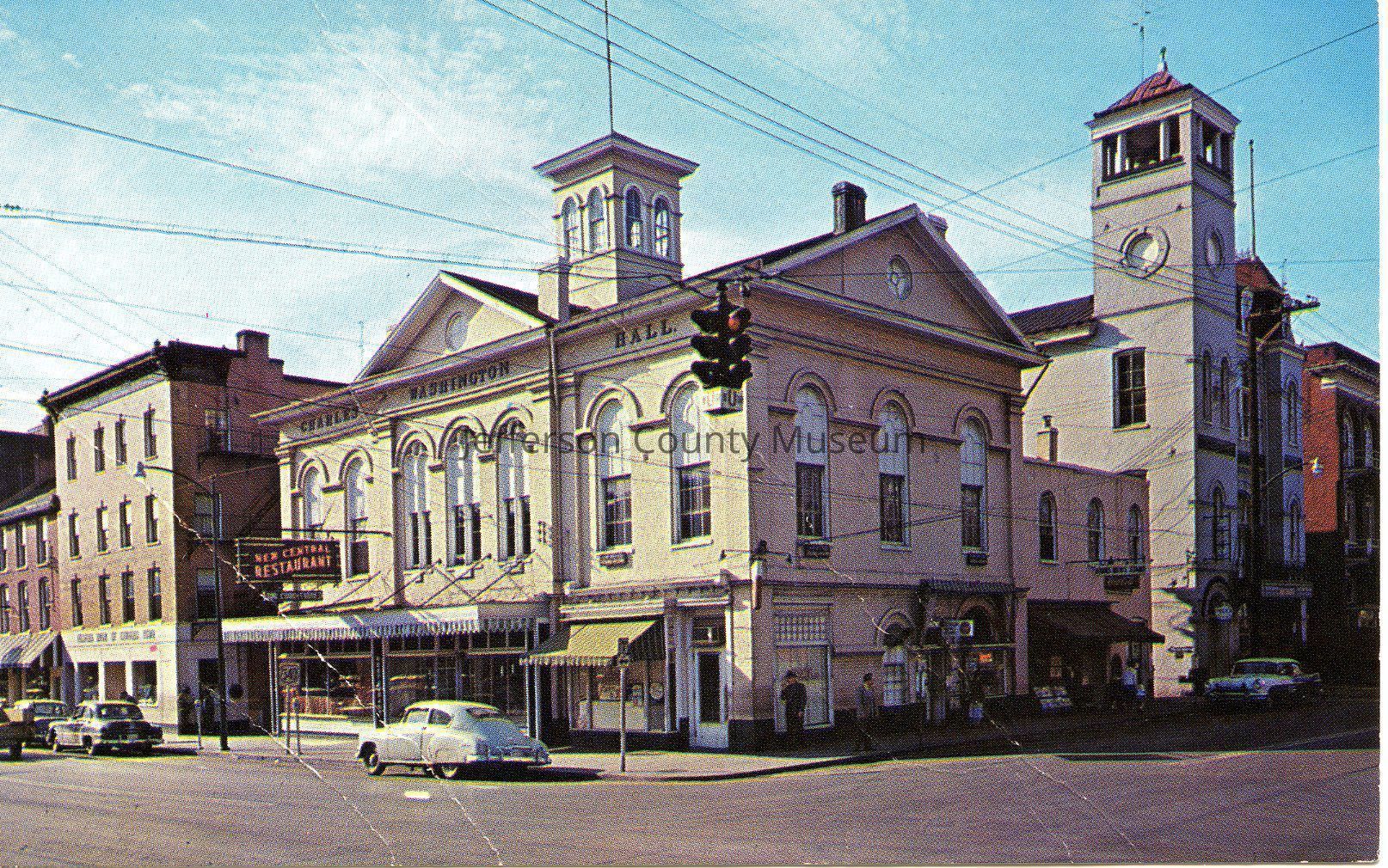 Downtown Charles Town, looking west from the intersection of George and Washington Streets. Gray or white vehicle is parked in front of the New Central Restaurant (Charles Washington Hall), on the viewer's right. Color by Frank D. Kelley, published by Kelley's Studio, 202 N. Potomac Street, Hagerstown, MD.Acquisition