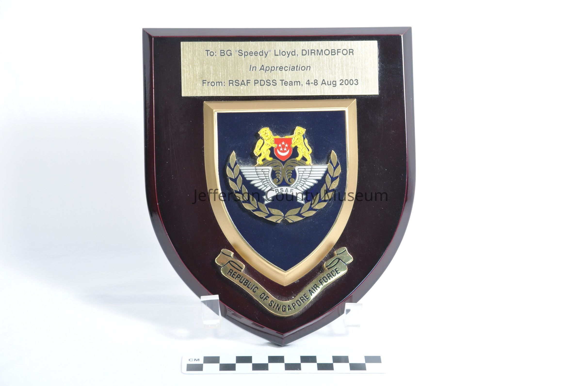 Dark wooden shield shaped plaque with label and coat-of-arms of Republic of Singapore Air Force. The gold colored label on top says "To: BG 'Speedy' Lloyd, DIRMOBFOR In Appreciation From: RSAF PDSS Team, 4-8 Aug 2003". The coat-of-arms is a black shield with gold border. On it are a standing lion and tiger holding a red shield with five stars and a crescent. The lion and tiger are standing on spread wings. Below the wings is a banner with "RSAF". There is a half-circle wreath below the wings. Below the black shield is a gold banner saying "REPUBLIC OF SINGAPORE AIR FORCE".Acquisition