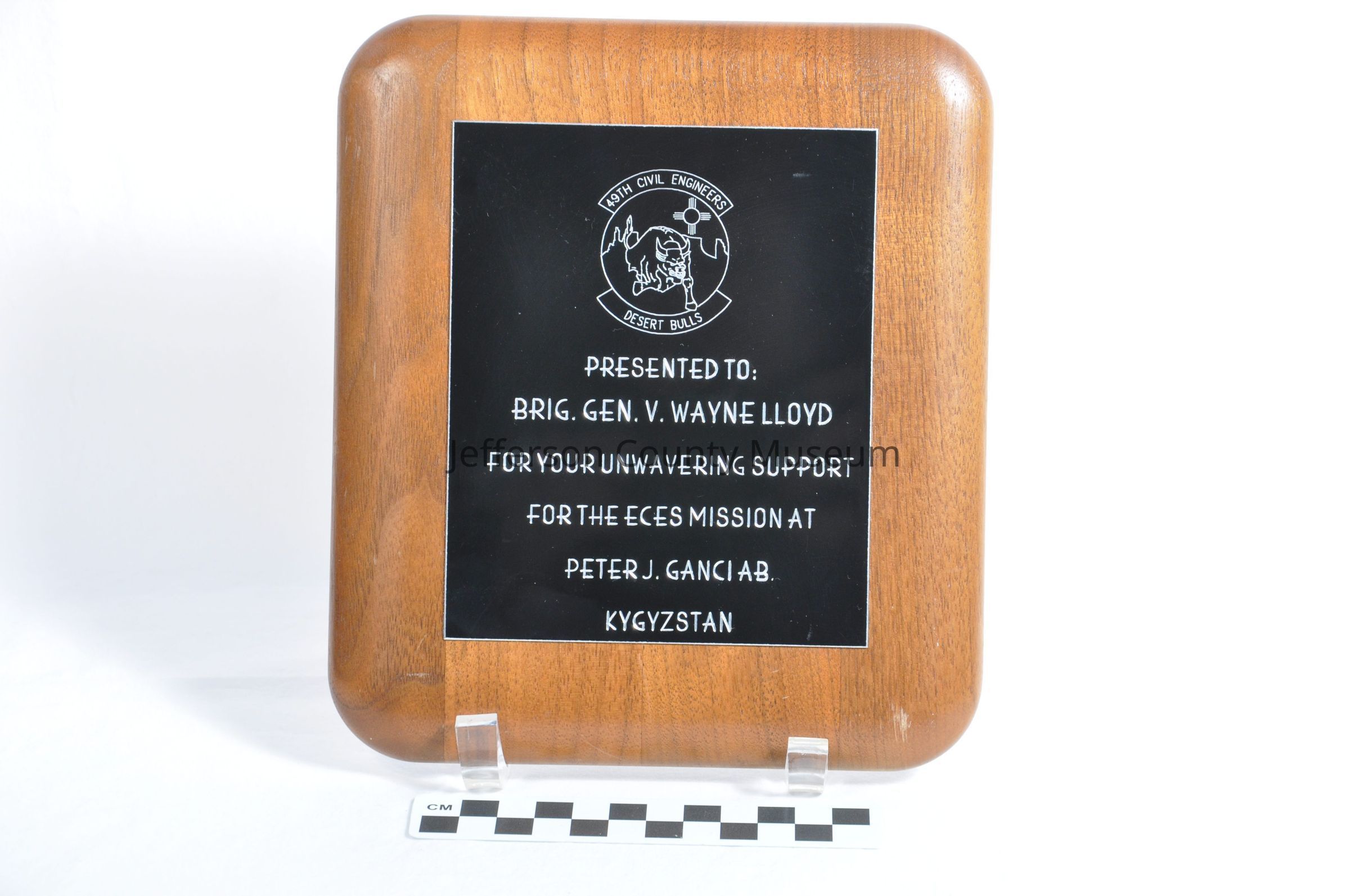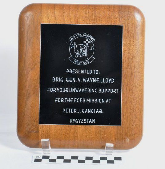 Wooden plaque with rounded edges with etched black metal plate attached. Circular symbol at top has a bull in the center with a sun symbol and mountains. At top of circle is "49TH CIVIL ENGINEERS". At bottom is "DESERT BULLS". Text says "PRESENTED TO BRIG. GEN. V. WAYNE LLOYD FOR YOUR UNWAVERING SUPPORT FOR THE ECES MISSION AT PETER J. GANCI AB. KYGYSTAN". (sic)Acquisition