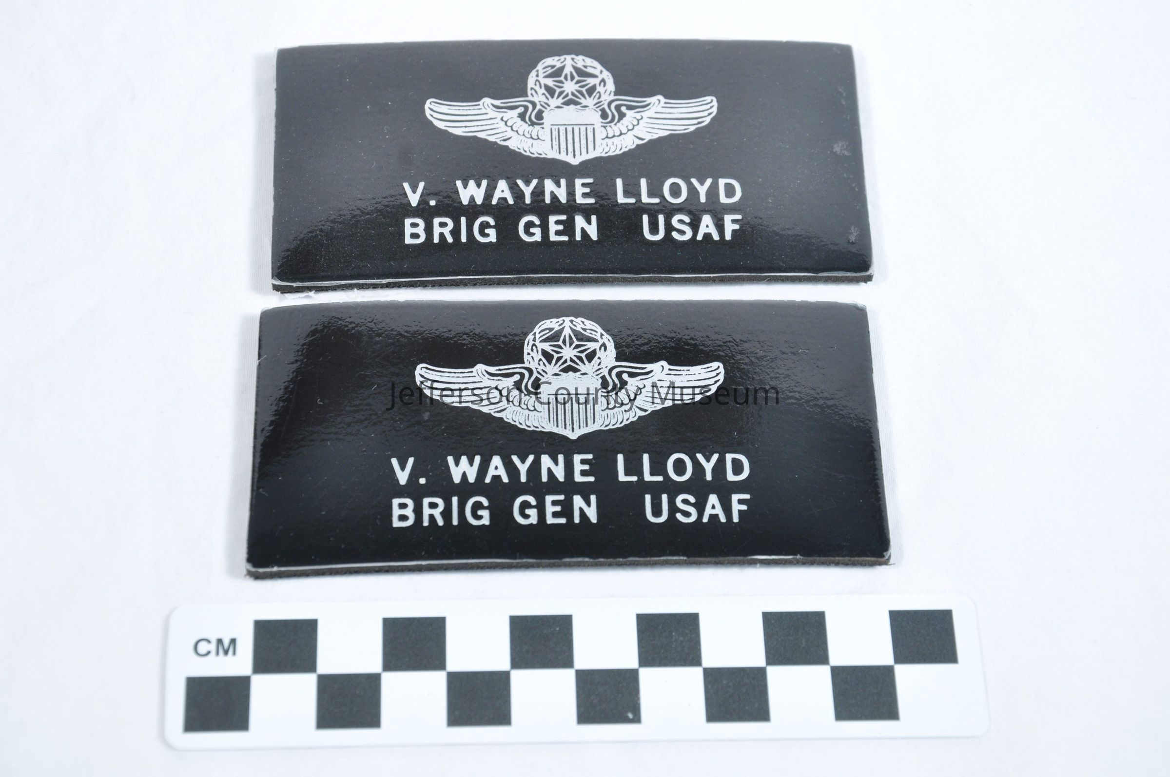 Two black rectangular name plates with silver Air Force symbol and "V. WAYNE LLOYD BRIG GEN USAF". Back has hook velcro attached for placing on uniform with loop velcro attached. Would be worn on flight jacket.Acquisition