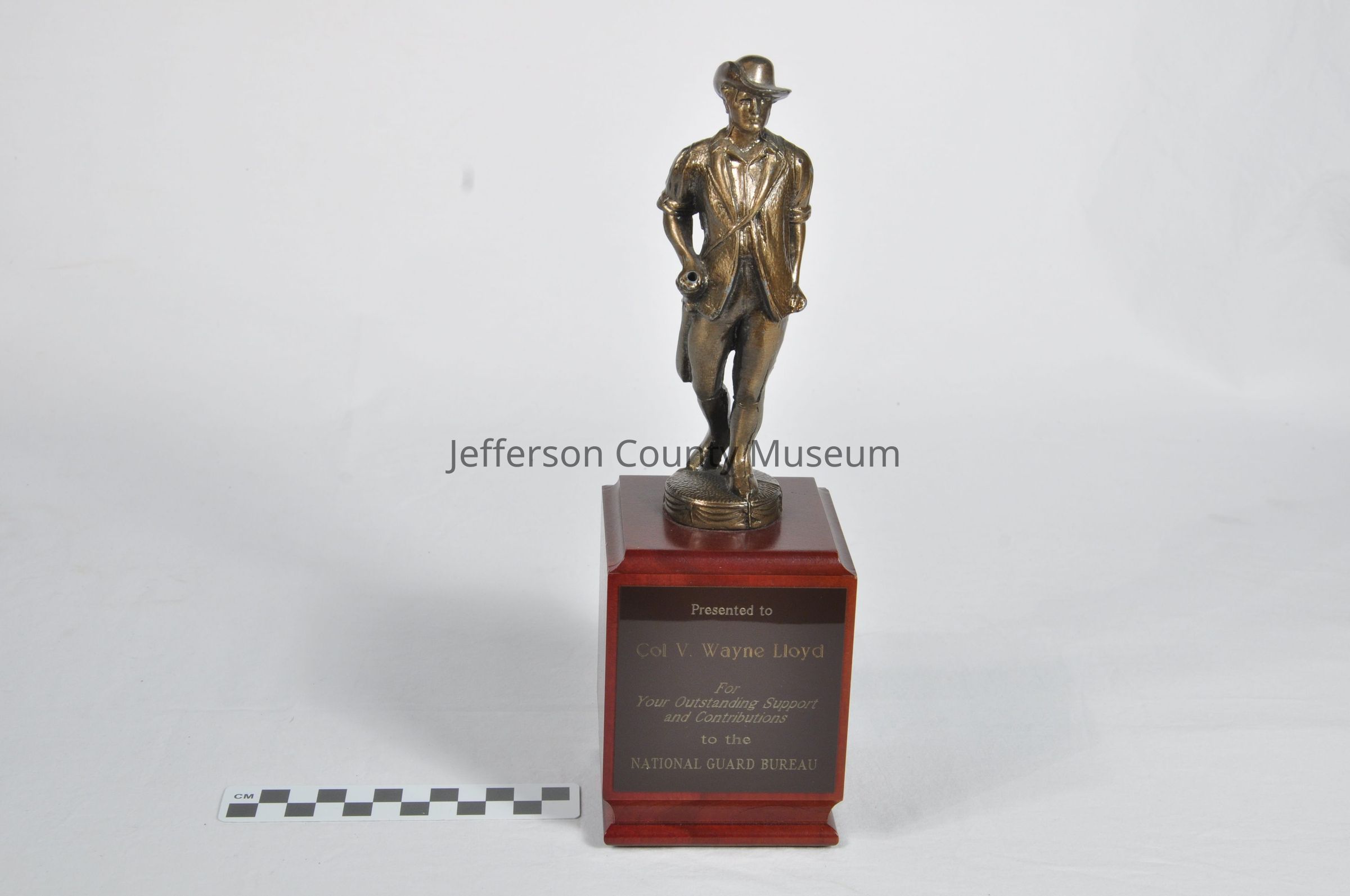 Award is a small statue of a minuteman holding a musket. Barrel of musket is missing. Statue is on a rectangular wooden base with a metal plate on front. Text on plate says "Presented to Col V. Wayne Lloyd For Outstanding Support and Contributions to the NATIONAL GUARD BUREAU".Acquisition