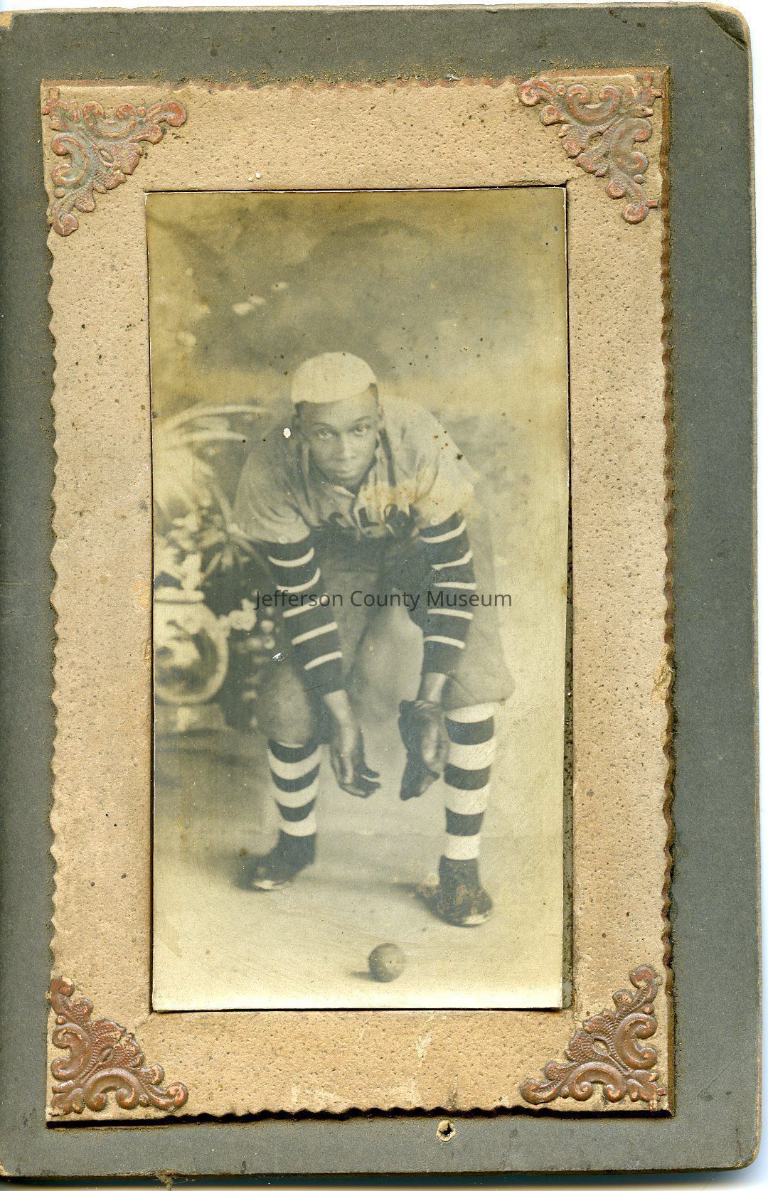 Unidentified African American man, wearing uniform with striped sleeves and striped socks and white cap, playing baseball. Photograph glued in cardboard "frame".Acquisition