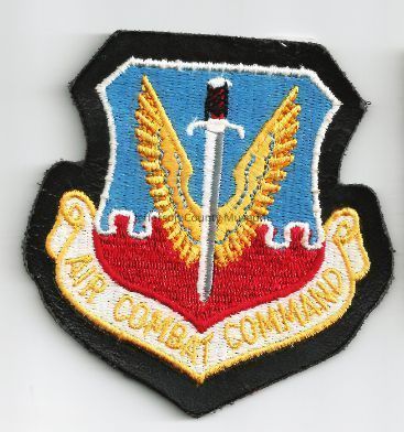 Shield shaped patch with red, white, blue, gold and black colors. Sword pointing down is in center with upright spread wings behind. At bottom in gold letters on white banner "AIR COMBAT COMMAND". Velcro hook material on back for attaching to uniform with velcro loop material.Acquisition