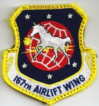 Shield shaped patch with red, white, blue and yellow colors. A red globe is in center with a white unicorn in front superimposed on the globe. There are three stars above in the blue field and three stars below. At bottom in blue on a white background is "167TH AIRLIFT WING". Velcro hook material on back for attaching to a uniform with velcro loop material.Acquisition