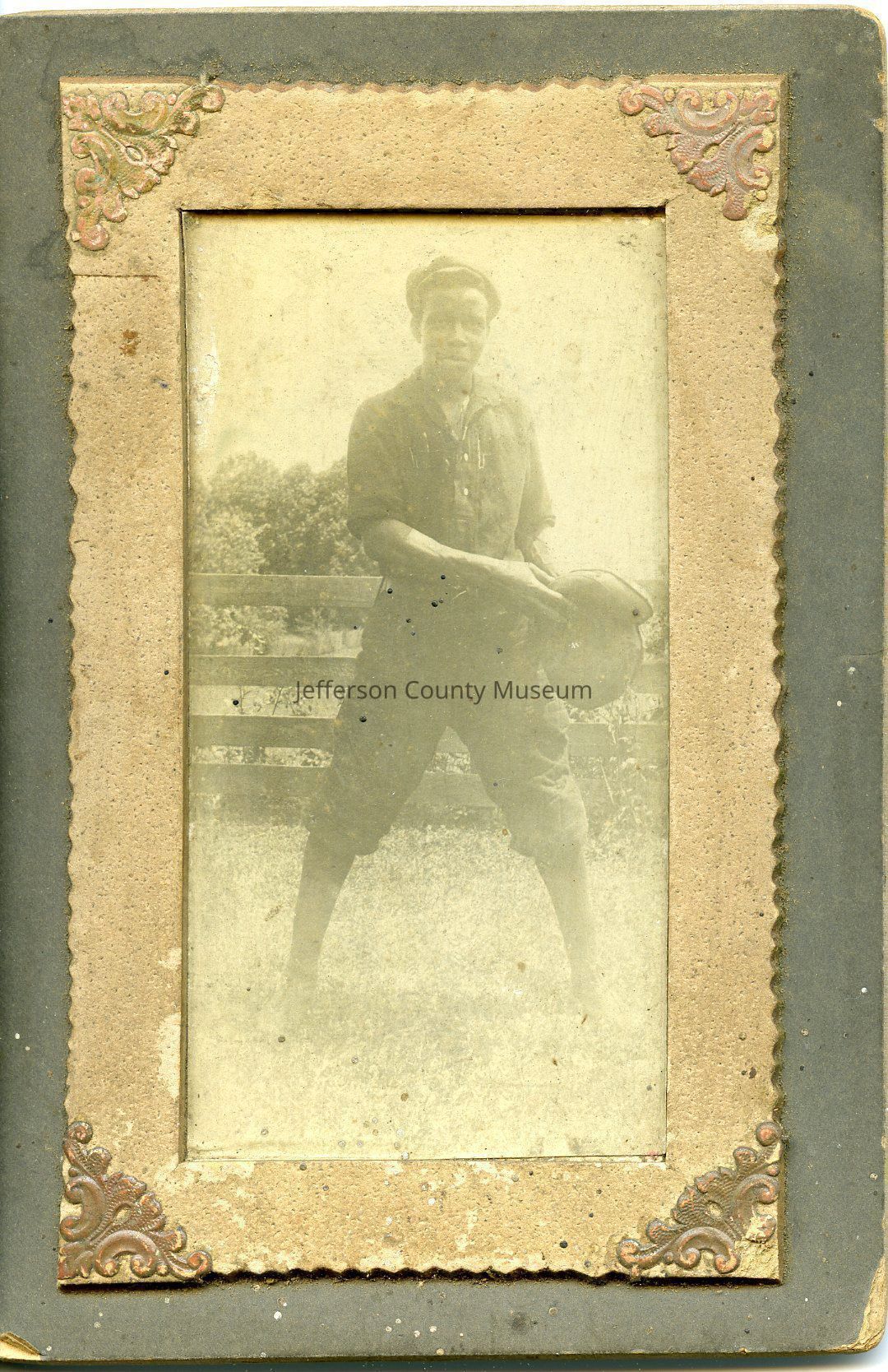 Unidentified African American man, wearing dark clothing or uniform and baseball mitt, standing in front of a four-board fence. Photograph glued in cardboard "frame".Acquisition