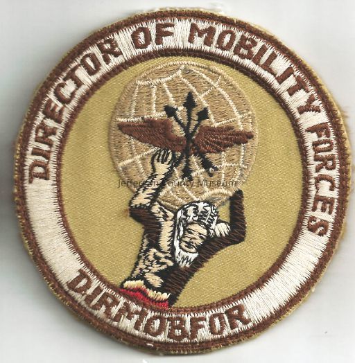 Round patch in subdued desert colors. Around the edge of the patch is "DIRECTOR OF MOBILITY FORCES DIRMOBFOR". In center is a person holding a globe on his back with spread wings and three crossed arrows superimposed on the globe. Velcro hook material on back for attaching to a uniform with velcro loop material.Acquisition